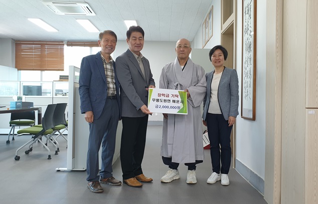 영월군 무릉도원면 혜운사는 관내 유일한 학교인 무릉초등학교에 200만 원의 장학금을 기탁했다.