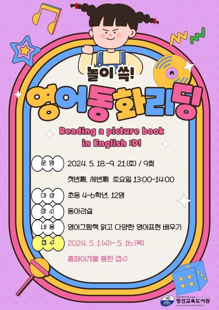 정선교육도서관(관장 권예순)은 오는 5월 18일부터 9월 21일까지 총 9회에 걸쳐 초등 4~6학년 대상 ‘놀이 쓱! 영어동화리딩’ 프로그램을 운영한다. 이번 프로그램은 학생들이 매회 한 권의 영어 그림책을 읽고, 독후활동을 통해 영어 표현을 익히고 말할 수 있도록 운영된다. 프로그램에서는 서로의 다름을 인정하고 존중하...