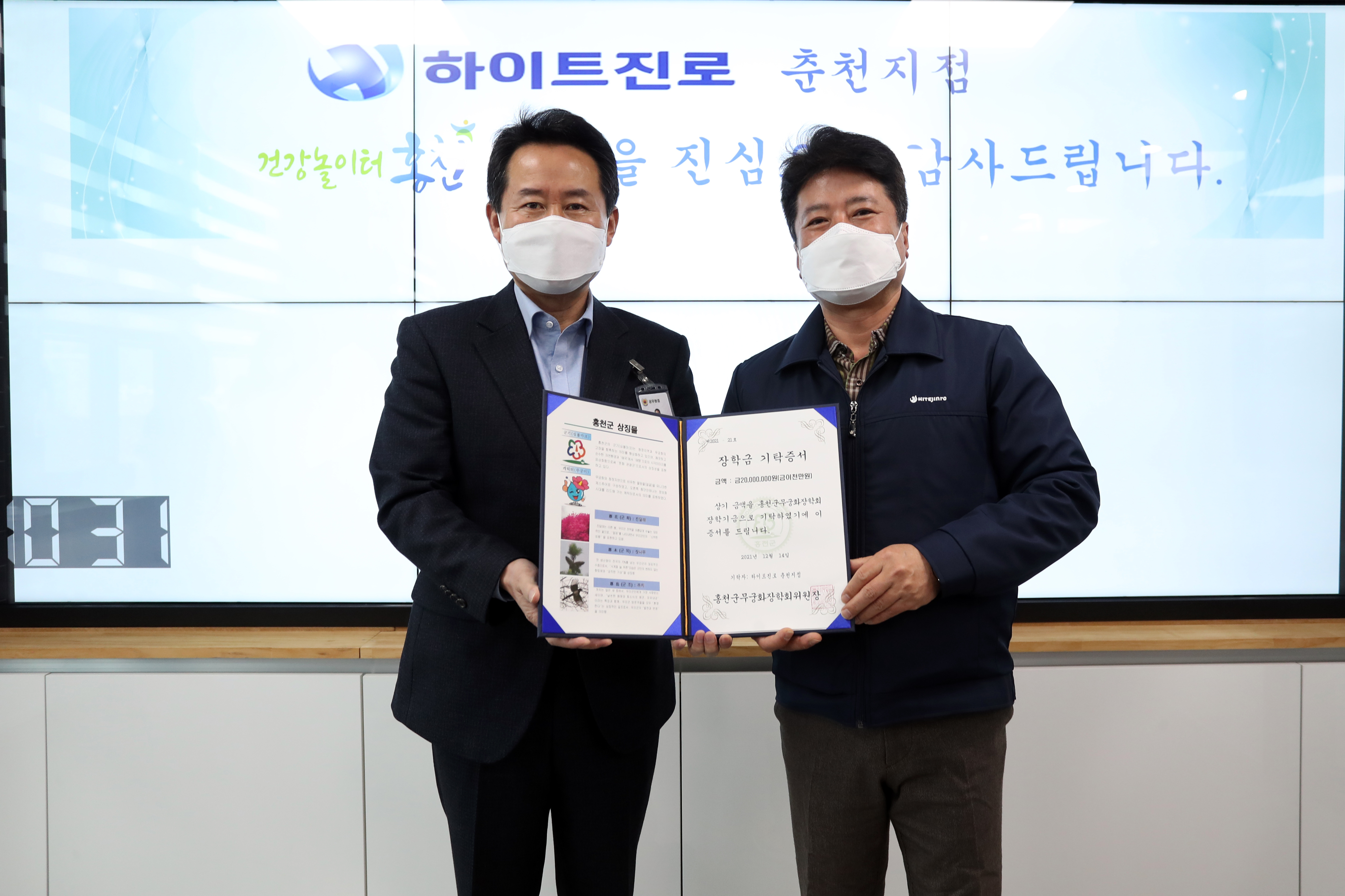 [강원사회복지신문 홍기한 기자]=하이트진로 강원공장·춘천지점과 홍천군번영회는 지난 12월 14일 홍천군청을 방문, 홍천군 인재육성을 위한 무궁화장학금 2,000만원을 기탁했다. 기탁식에는 하이트진로 강원공장장 김성곤 상무와 박진호 춘천지점장, 이규설 홍천군번영회장, 박종구 홍천교육지원청 교육장이 참석했다. 하이...