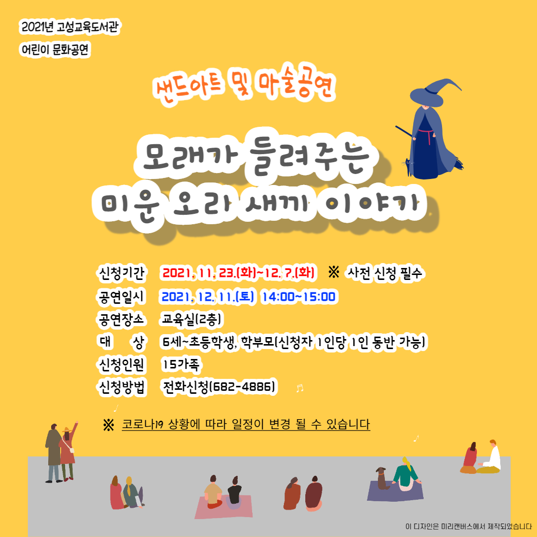 [강원사회복지신문 이정환 기자]=고성교육도서관(관장 이승봉)은 지역 어린이들에게 코로나로 인해 단절되어 가는 사회적 분위기를 극복하는 기회가 되기를 바라는 마음으로 어린이 문화공연 '모래가 들려주는 미운 오리 새끼 이야기'를 오는 12월 11일(토) 오후 2시 우리 도서관 교육실에서 진행한다. 어린이 문화공연 '모래...