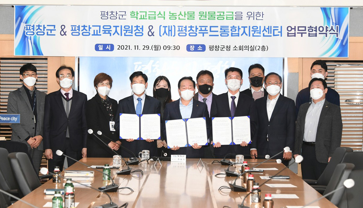 [강원사회복지신문 홍기한 기자]=평창군 학교급식 농산물 원물 공급을 통한 로컬푸드 농산물 소비 확대 평창군은 지난 11월 29일(월) 10시에 군청 소회의실에서 평창군 학교급식 농산물 원물 공급을 위한 평창군-평창교육지원청-(재)평창푸드통합지원센터 간 업무협약을 체결했다고 밝혔다. 평창군, 평창교육지원청 및 (재)평...