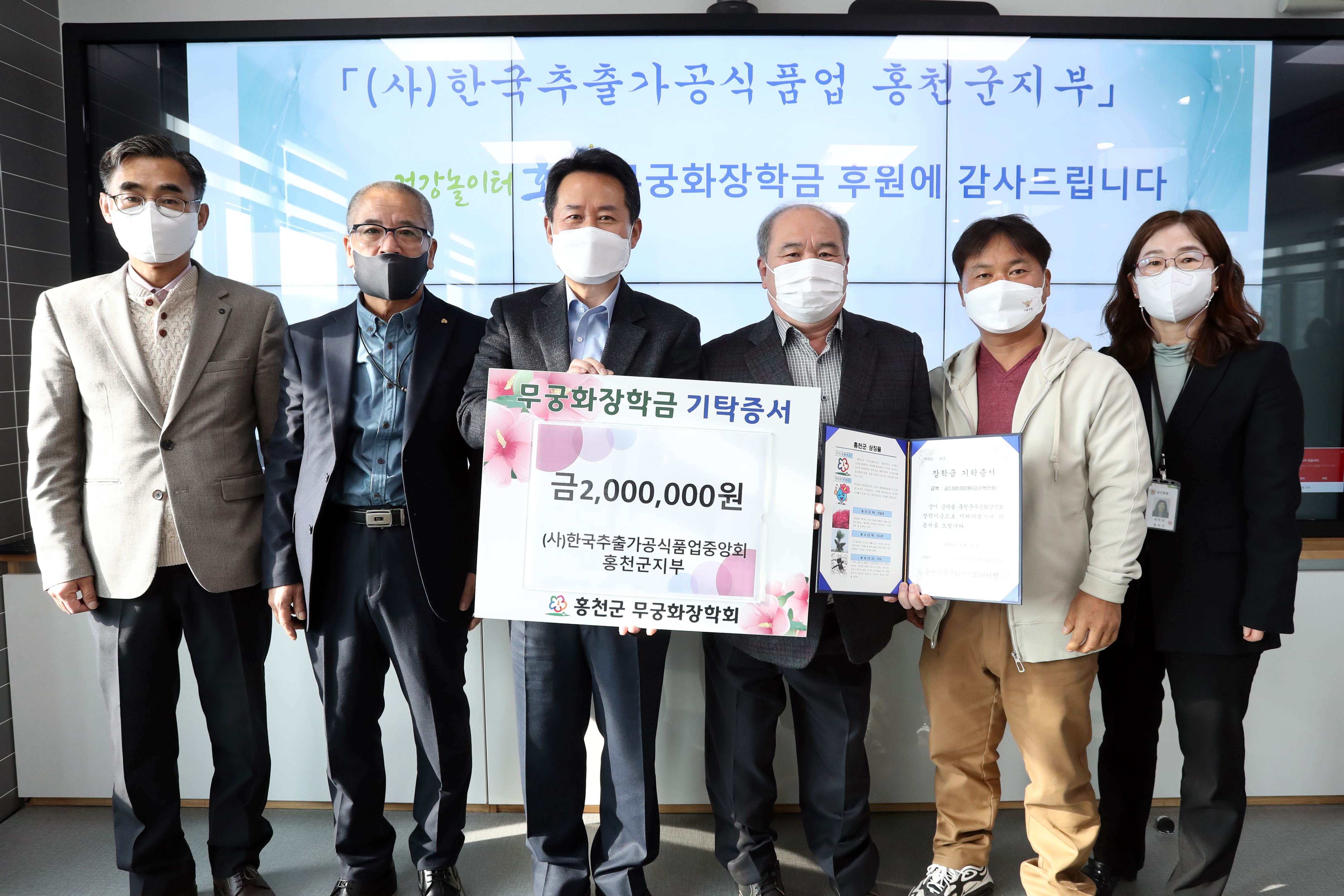 [강원사회복지신문 홍기한 기자]=(사)한국추출가공식품업중앙회 홍천군지부(지부장 이철구)는 지난 11월 29일 홍천군청을 방문, 무궁화장학금 200만원을 기탁했다.