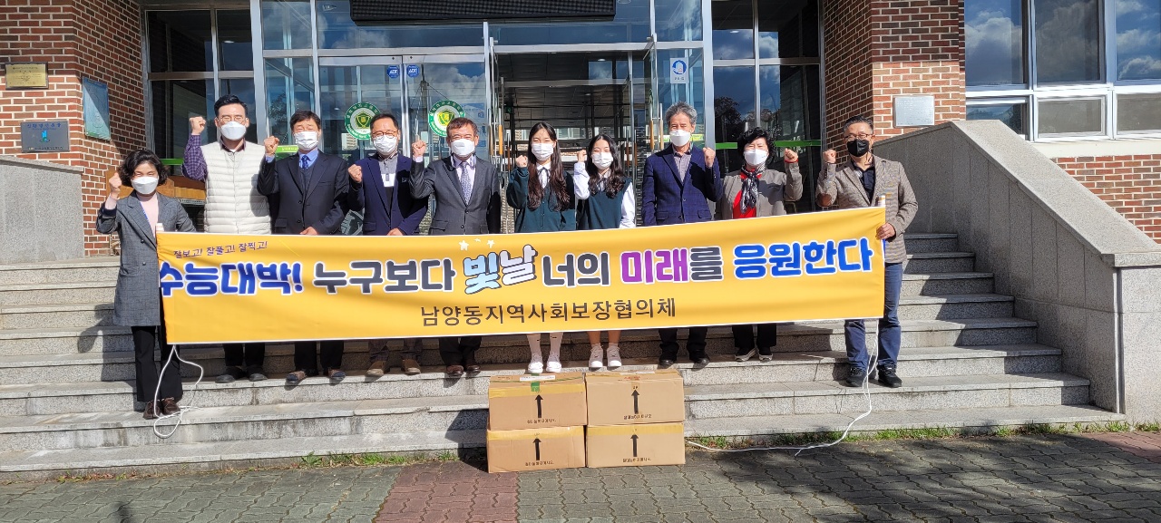 [강원사회복지신문 김종한 기자]=삼척시 남양동지역사회보장협의체(위원장 김기삼)는 지난 11월 10일 관내 고등학교(삼척여자고등학교, 삼일고)를 방문하여 고3 수험생 250명에게 100만원상당 찹쌀떡 등을 전달하면서 수능대박을 응원했다.