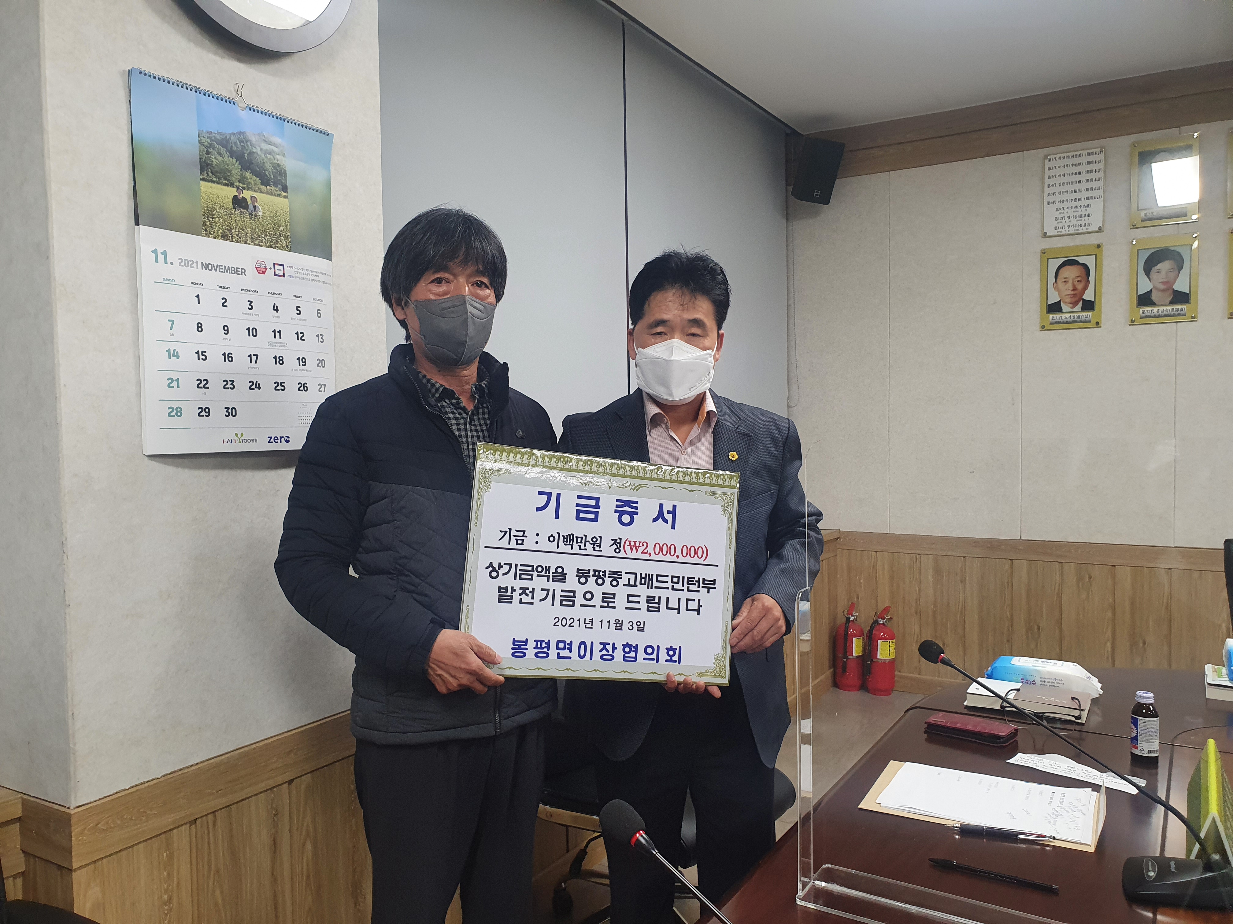 [강원사회복지신문 이정환 기자]=평창군 봉평면이장협의회(회장 연시권)가 코로나19로 훈련에 어려움을 겪고 있는 봉평중고 배드민턴부를 위해 200만원의 장학금을 전달한 사실이 뒤늦게 알려져 훈훈함을 더하고 있다. 봉평면 이장협의회는 11월 이장회의와 함께 장학금 기탁식을 진행했으며, 기탁식에는 김형일 봉평중고등학...