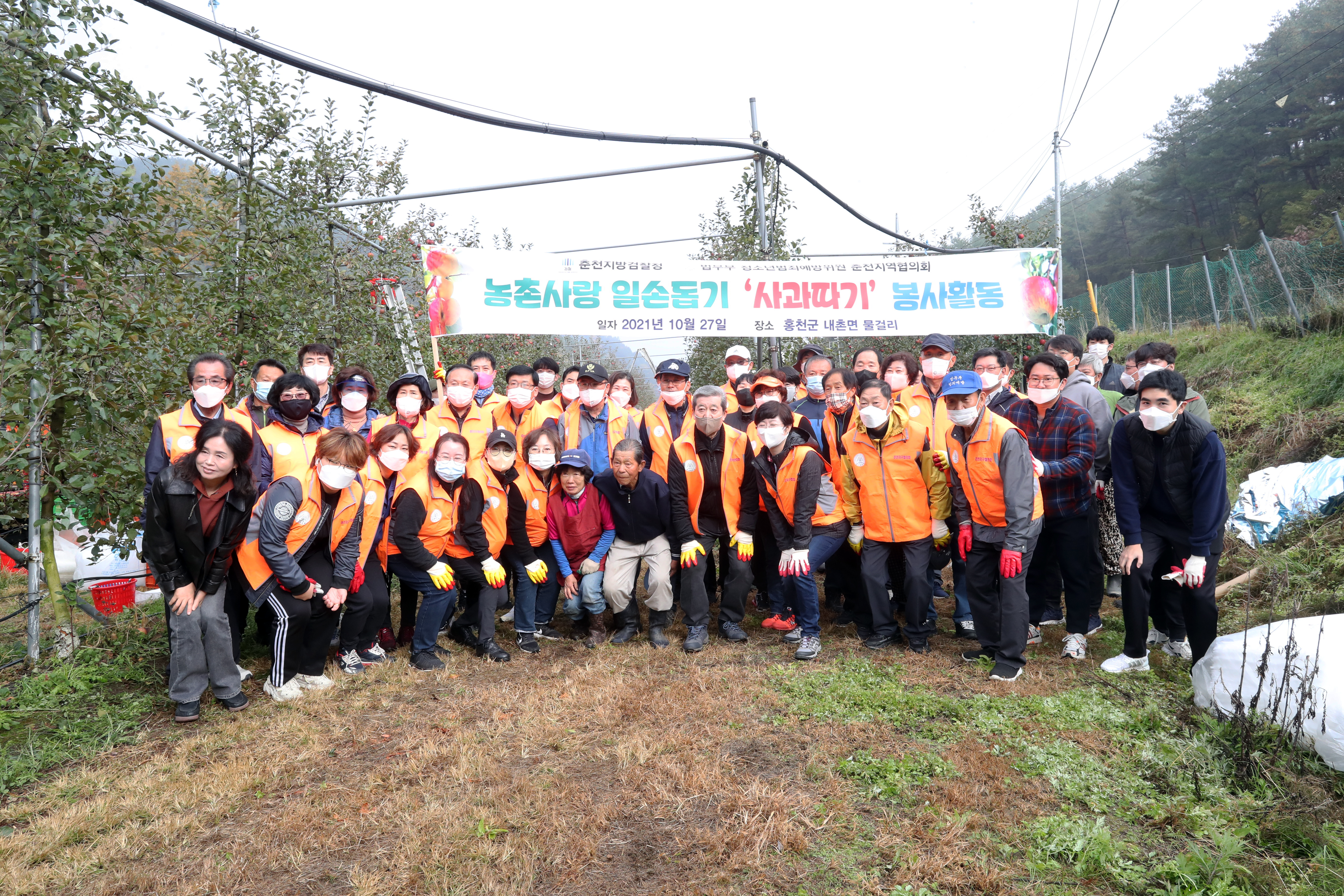 [강원사회복지신문 서은진 기자]=춘천지방검찰청 청소년범죄예방위원 춘천지역협의회는 지난 10월 27일 홍천군 내촌면 물걸리의 한 과수원에서 농촌사랑 일손 돕기 '사과 따기' 봉사활동을 펼쳤다. 봉사활동에는 허필홍 홍천군수도 참여, 함께 일손을 도왔다.