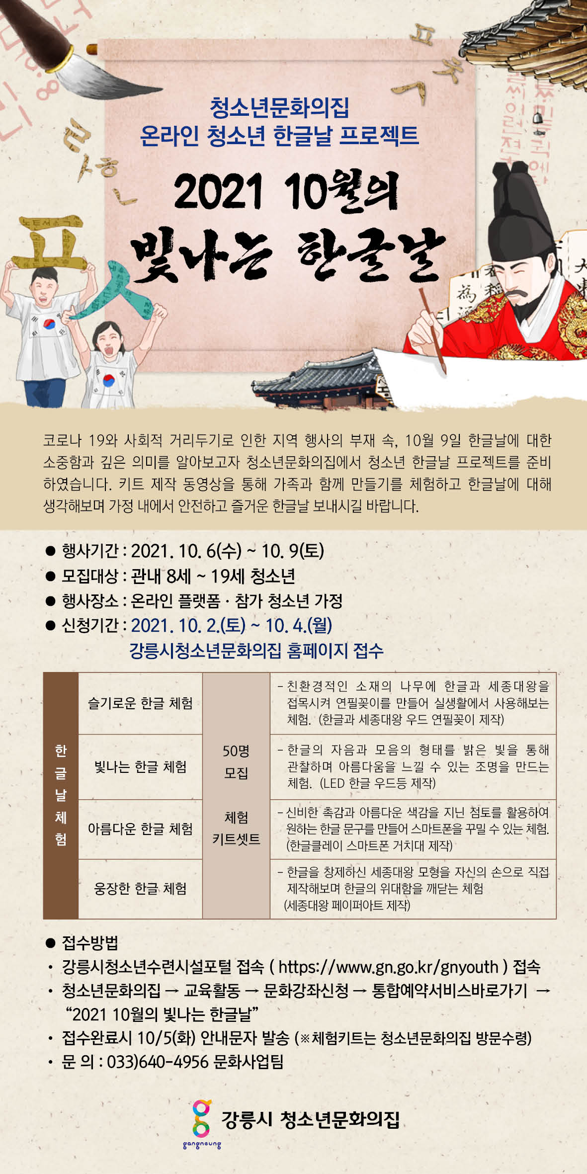 [강원사회복지신문 서은진 기자]='10월의 빛나는 한글날' 온라인 체험활동 개최 강릉시청소년문화의집은 이번 한글날을 맞이하여 온라인 청소년 한글날 체험프로그램 '2021년 10월의 빛나는 한글날'을 운영했다. '10월의 빛나는 한글날 체험 프로그램'은 한글의 의미와 소중함을 깨닫고자 한글날 연휴동안 청소년들이 한글에...