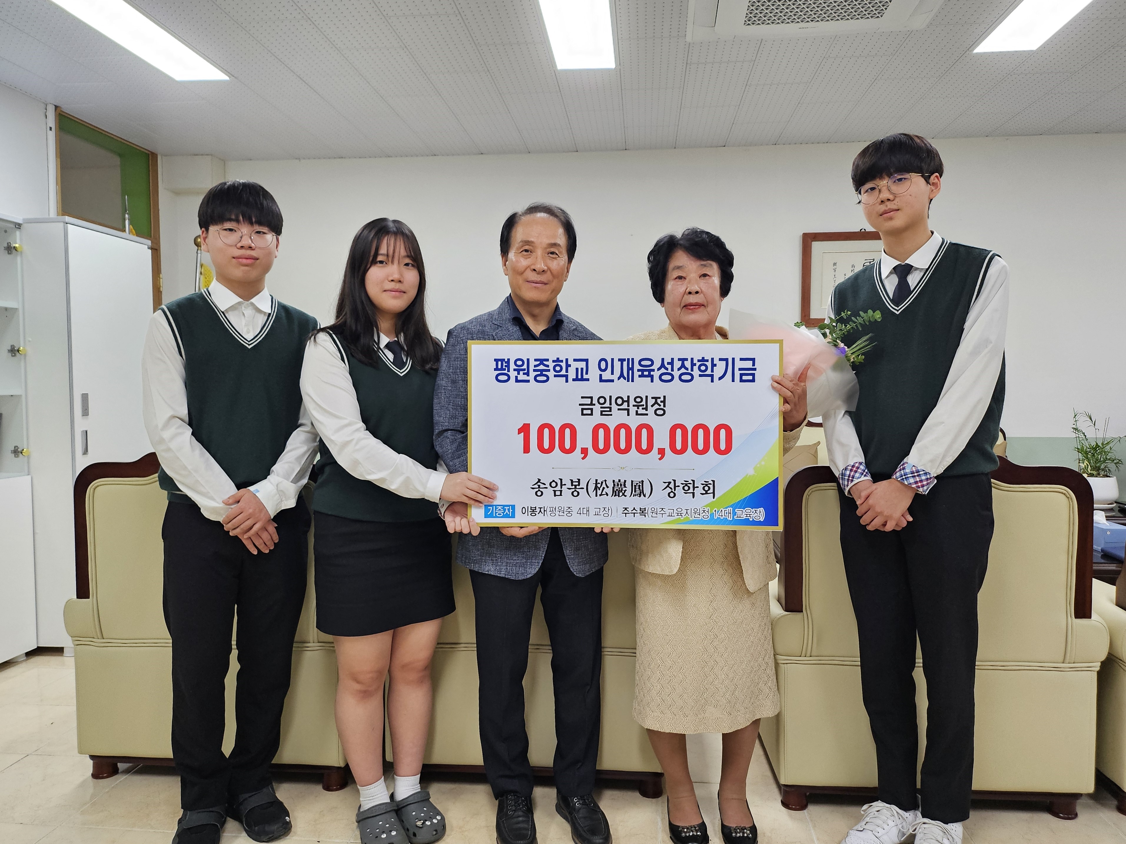 “평원중, ‘송암봉(松巖鳳) 장학회’ 설립” 평원중학교(교장 박종범)는 지난 4월 15일(월) 교장실에서 ‘평원중학교 인재육성장학기금’ 기탁식을 개최했다. 이날 기탁식에는 1999년 9월 1일부터 2002년 8월 31일까지 평원중학교 4대 교장으로 재직했던 이봉자 교장이 참석해 인재육성장학기금 1억 원을 평원중학교에 기탁...