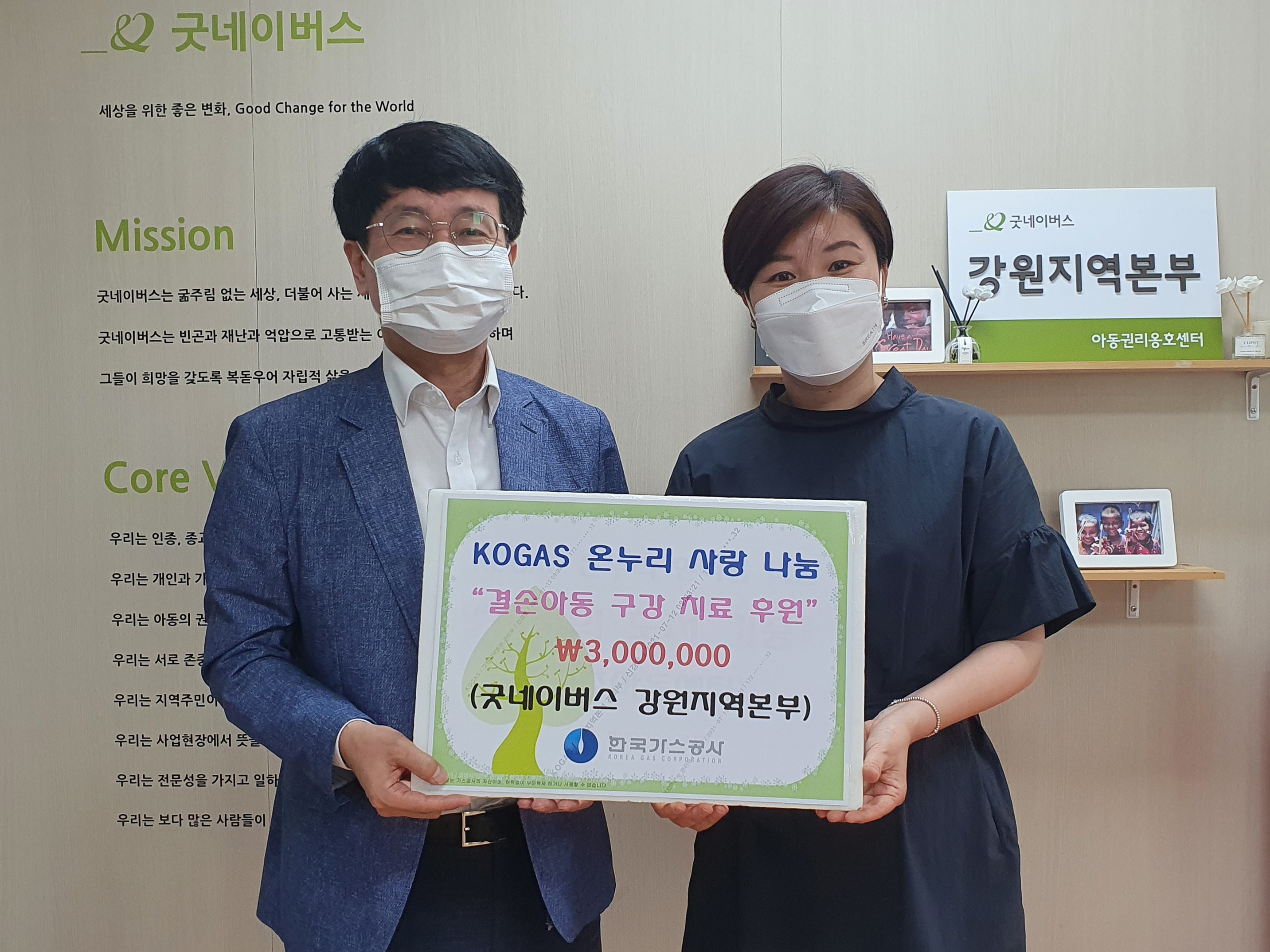 [강원사회복지신문 서은진 기자]=지역 내 초·중·고등학생 치과치료 및 예방을 위한 사업 후원 굿네이버스 강원지역본부(본부장 박미경)는 한국가스공사 강원지역본부(본부장 양동훈)로부터 취약계층아동 구강건강관리 지원을 위한 '스마일(Smile) 서포터즈' 사업 후원금 300만원을 전달받았다고 지난 7월 22일(목) 밝혔다....