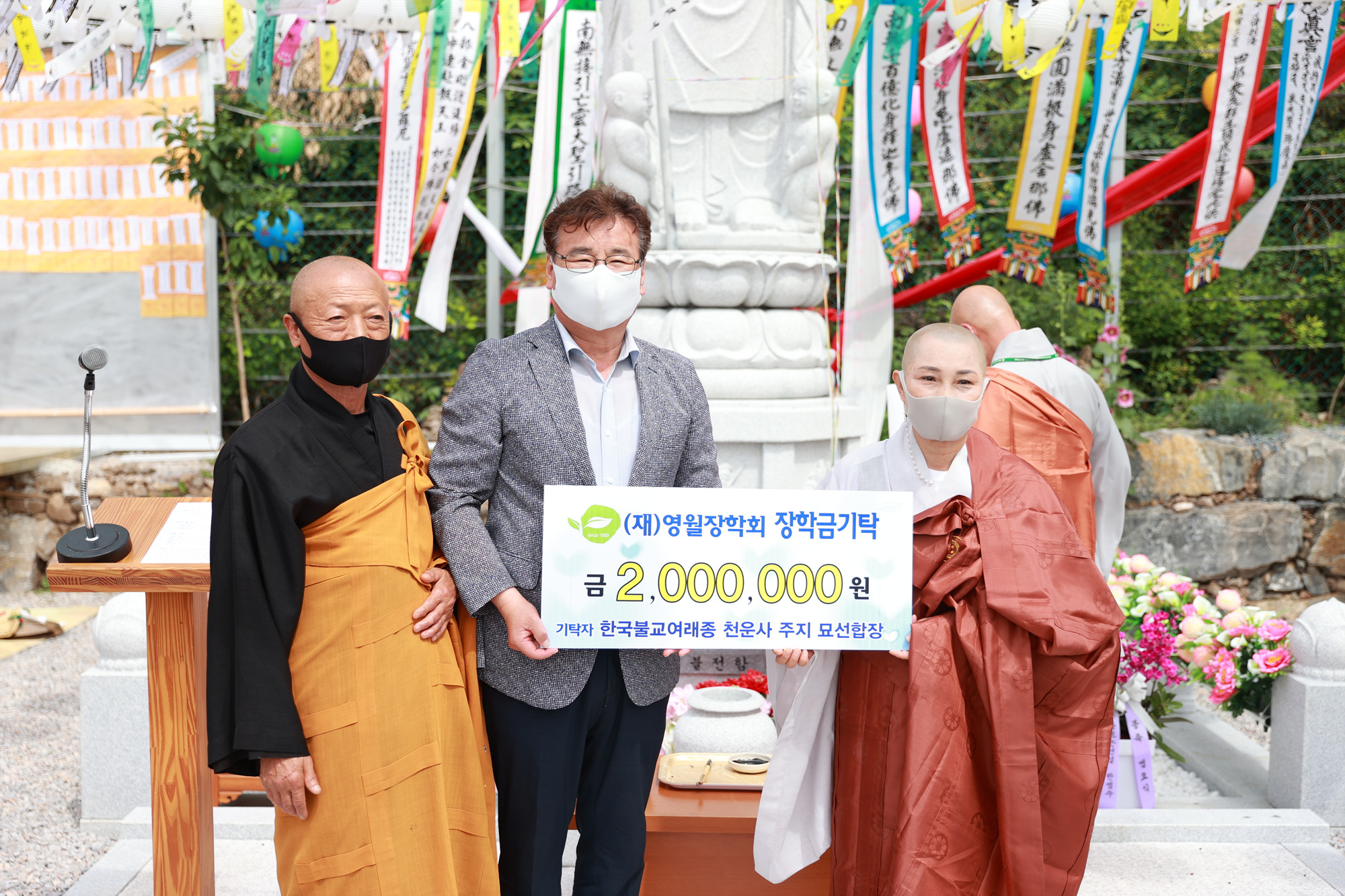 [강원사회복지신문 이정환 기자]=한국불교여래종 천운사주지묘선합장(주지 고묘선)에서 지난 7월 3일 영월지역 인재육성을 위해 장학금으로 쓰이길 바란다며 2백만원을 재단법인 영월장학회(이사장 최명서)에 기탁하였다.