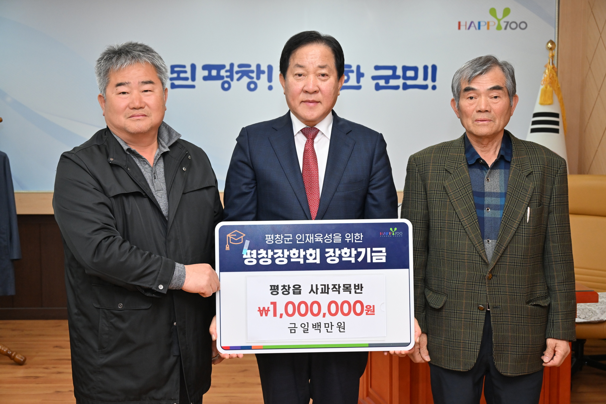 평창군 용평면에 위치한 본심사(주지스님 유각)와 평창읍 사과작목반(회장 김성기)은 지난 3월 21일 지역 인재 육성을 위한 평창장학회에 장학기금으로 각각 200만원, 100만원을 기탁하였다.