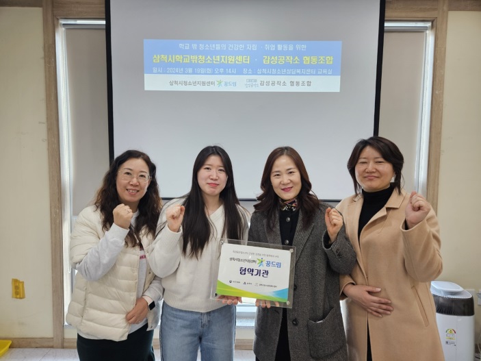 삼척시학교밖청소년지원센터(센터장 : 김정희)와 감성공작소 협동조합(대표 : 신예원)이 지난 3월 19일 업무협약을 체결했다. 삼척시학교밖청소년지원센터와 감성공작소 협동조합은 삼척지역 학교 밖 청소년들의 자립 및 취업 지원을 위해 감성공작소에서 운영하는 염색, 유리공예 등 다양한 체험 프로그램을 가동하기로 했다...