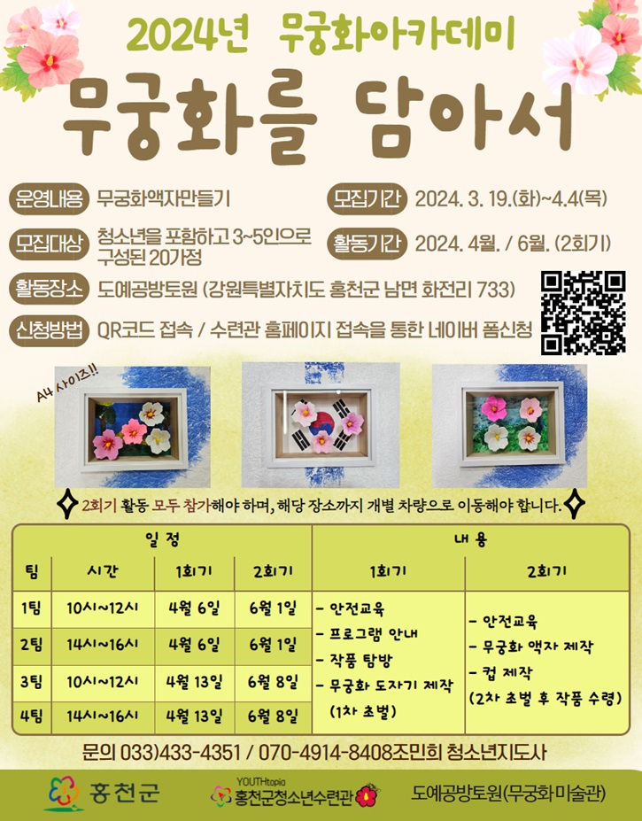 홍천군청소년수련관(관장 박형준)은 3월 21일(목)부터 4월 4일(목)까지 관내 청소년을 포함한 20가정을 대상으로 무궁화아카데미 ‘무궁화를 담아서’ 참가자를 모집한다고 밝혔다. 무궁화아카데미는 홍천의 역사·문화·관광지에 관련된 교육활동과 체험을 진행하여 내 고장 홍천에 대한 이해와 관심을 향상할 수 있도록 기...