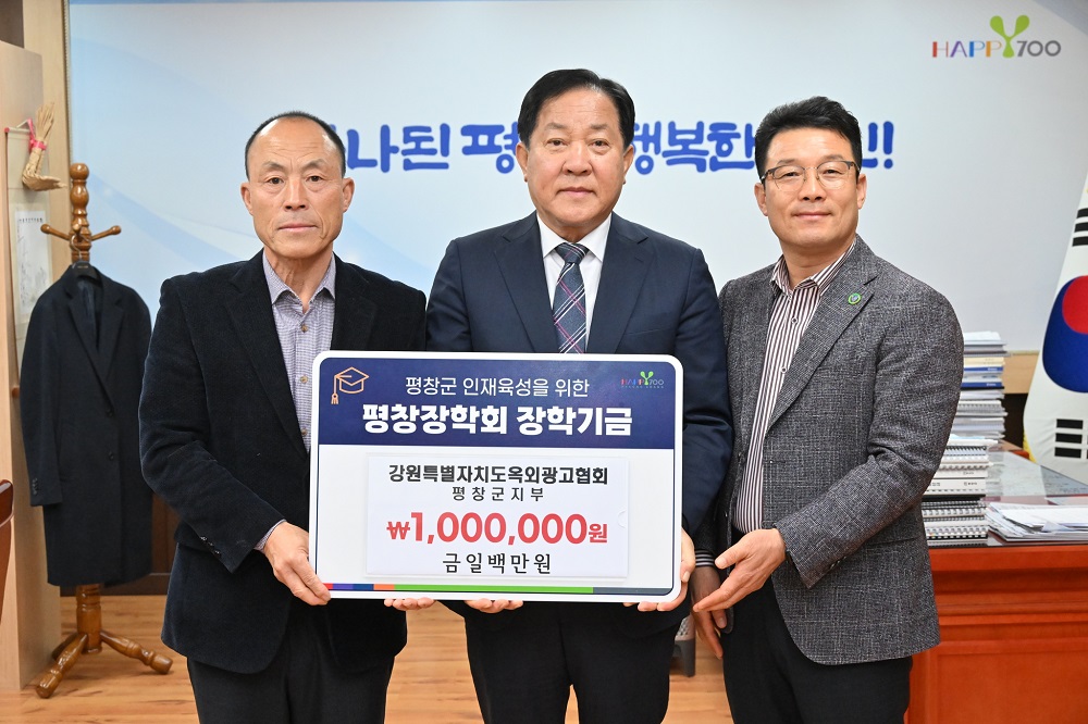 강원특별자치도옥외광고협회 평창군지부(지부장 남영기)는 지난 2월 29일 평창군청을 방문하여 평창장학회에 장학금 1백만 원을 기탁하였다. 강원특별자치도옥외광고협회 평창군지부는 장학사업에 관심을 갖고 지난 2015년부터 2024년까지 장학금 총 1,000만 원을 기탁하는 등 사회 환원 활동에 앞장서고 있다.