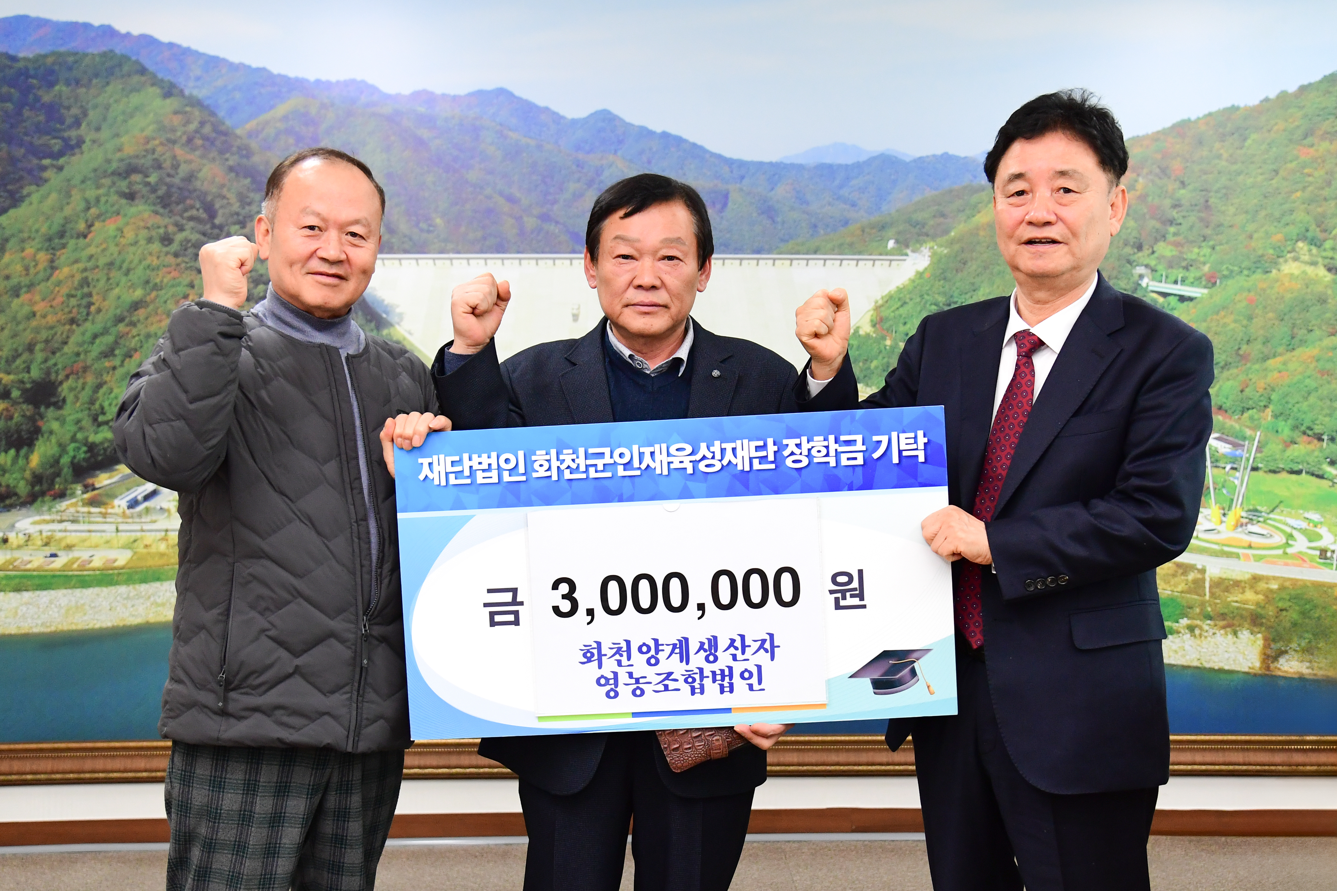화천양계생산자영농조합법인(대표:이기웅)은 지난 2월 28일 최문순 화천군 인재육성재단 이사장을 방문해 장학금 300만원을 기탁했다.