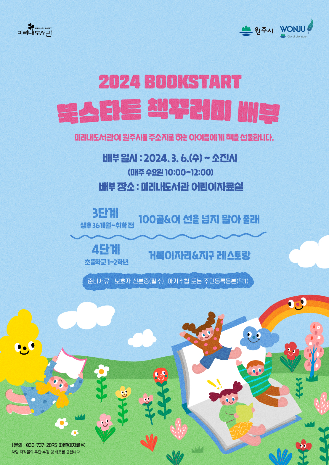 3월 6일(수)부터 매주 수요일 10시∼12시 선착순 배부 원주 미리내도서관(관장 백연순)은 오는 3월 6일(수)부터 관내 아동 대상 북스타트 책꾸러미를 선물한다. 북스타트란 ‘책과 함께 인생을 시작하자’는 취지의 독서문화운동으로 미리내도서관에서는 책꾸러미 배부, 후속 프로그램 운영, 양육자 교육 등 다양한 사업을 진...