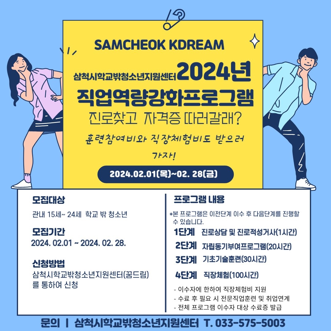삼척시학교밖청소년지원센터가 '2024년 직업역량강화 프로그램' 대상자를 모집 중이라고 밝혔다. 여성가족부와 강원특별자치도가 함께 하는 '2024년 직업역량강화 프로그램' 사업은 자립을 꿈꾸는 청소년들에게 직업 선택과 관련한 다양한 체험 기회를 제공하고 자립 동기를 고취하기 위해 마련되었다. 15세~24세 학교밖 청소...