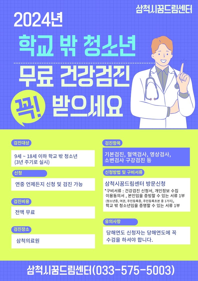 삼척시학교밖청소년지원센터(삼척시꿈드림센터)는 학교 밖 청소년들이 건강하게 성장할 수 있도록 지원하기 위해 건강검진 사업을 실시한다고 밝혔다. 건강검진 대상은 9세~18세 이하 학교 밖 청소년이면 누구나 신청이 가능하며 검진항목은 기본검진, 혈액검사, 영상검사, 소변검사, 구강검사 등이다. 대상자들은 3년 주기로...