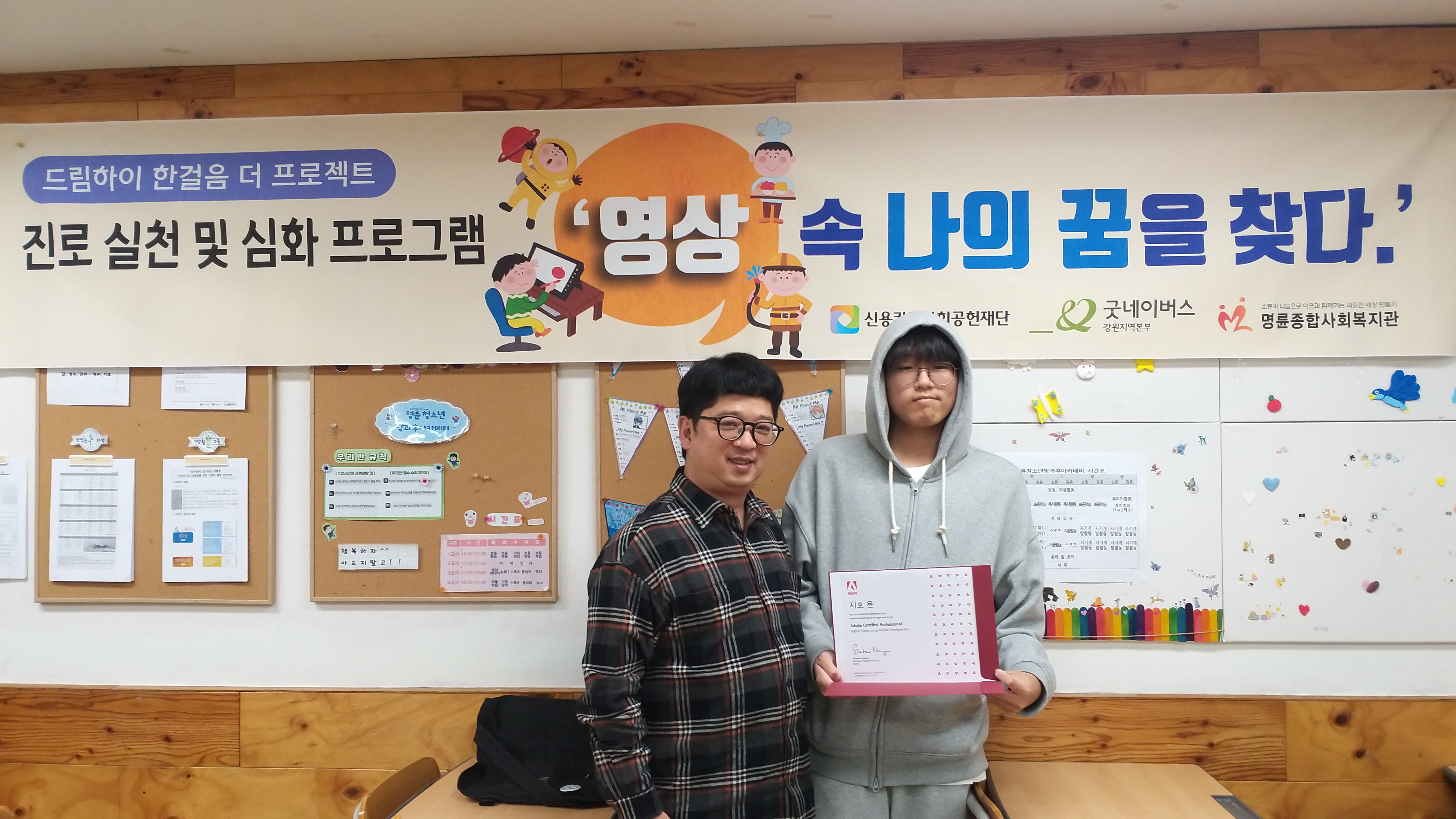 원주 명륜종합사회복지관(관장:박현숙) 청소년방과후아카데미(이하 : 명륜청소년방과후아카데미) 중등반 대상으로 지난 10월 19일(목) 17:50~19:40분까지 ACA프리미어프로 자격시험을 실시하여, 응시자 중 1명이 ACA프리미어프로 자격증을 취득하였다. 명륜청소년방과후아카데미는 2022년부터 신용카드사회공헌재단과 굿네이...