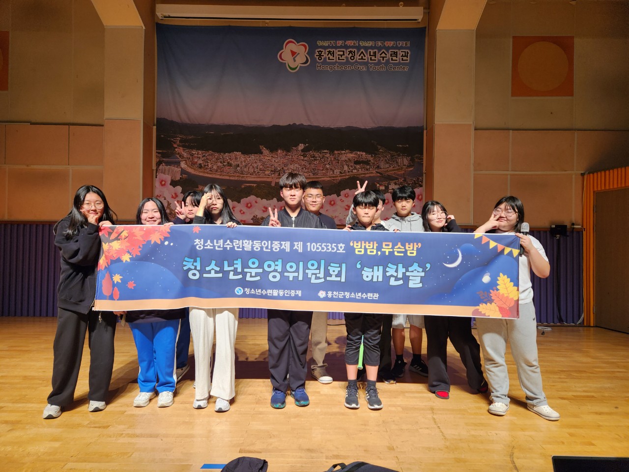 [강원사회복지신문 김도연 기자]=홍천군청소년수련관(관장 박형준) 청소년운영위원회 '해찬솔'은 11명은 지난 10월 13일(금) 오후 7시부터 10월 14일(토) 오전 6시까지 청소년수련활동인증제 '밤밤,무슨밤' 캠프를 진행했다. 청소년수련활동인증제는 청소년이 안전하고 유익한 활동에 참여할 수 있도록 일정기준에 따라 심사...