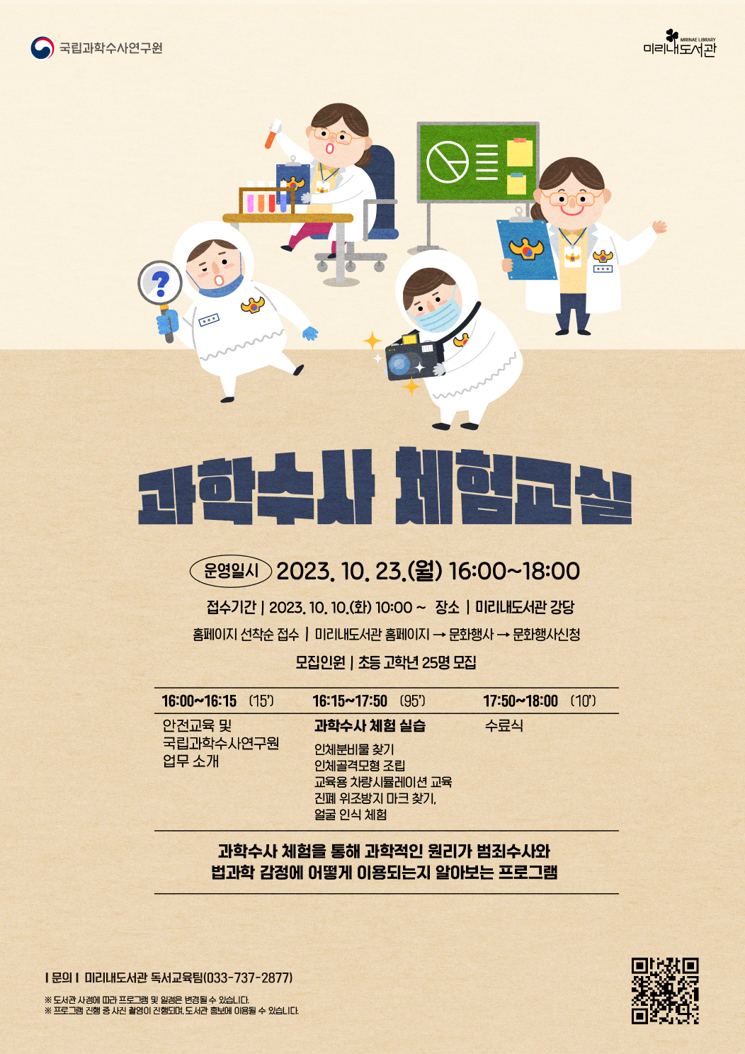 [강원사회복지신문 서은진 기자]=10월 10일(화) 오전 10시부터 도서관 홈페이지에서 선착순 접수 원주 미리내도서관(관장 백연순)은 오는 10월 23일 오후 4시에 미리내도서관 강당에서 '과학수사 체험교실'을 운영한다. 초등 고학년을 대상으로 진행되는 이번 강의는 '과학수사 체험'을 주제로 이주선 국립과학수사연구원 법...