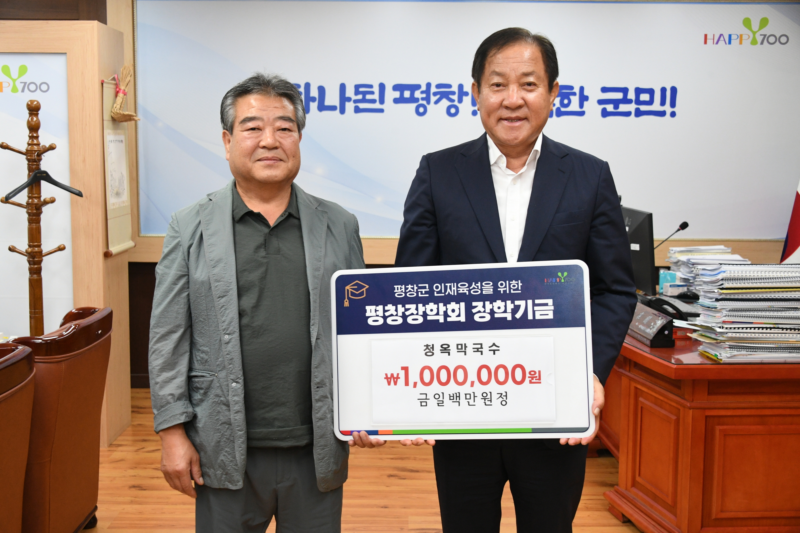 [강원사회복지신문 이정환 기자]=평창읍에 위치한 청옥막국수(대표 송진호)는 지난 9월 15일 평창군청을 방문하여 평창장학회에 장학금 100만 원을 기탁하였다. 송진호 대표는 "평창군의 학생들의 성장을 돕고 인재육성에 보탬이 되고자 장학금을 기부하게 되었다.”라며“학생들이 대한민국 발전을 이끄는 인재로 성장하길 ...
