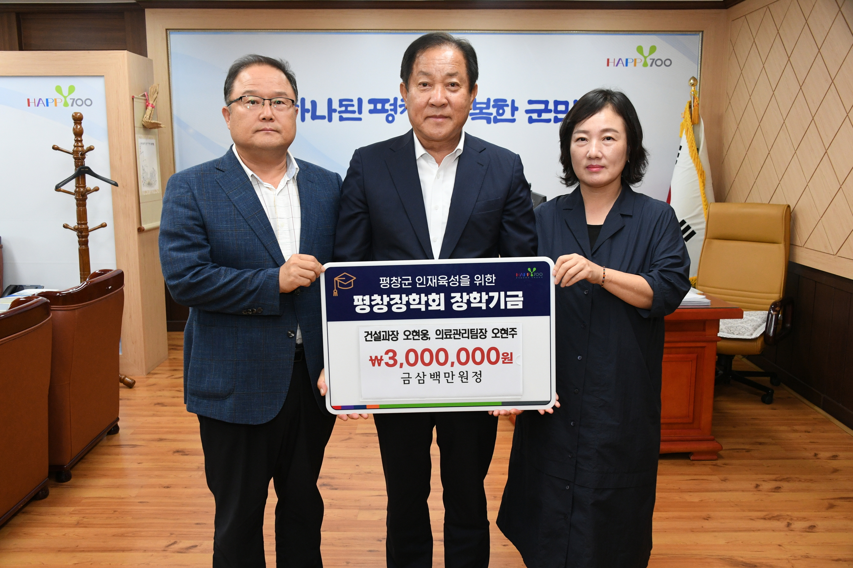 [강원사회복지신문 홍기한 기자]=평창군청 오현웅 건설과장과 오현주 의료관리팀장 남매는 부친상 부의금을 평창장학회에 기탁해 주위의 귀감이 되고 있다. 남매는 지난 9월 14일 평창장학회(이사장 심재국)을 방문하여 장학금 300만원을 기탁했다. 이번 장학금 전달은 지난 8월 29일 부친상의 부의금 일부를 기탁한 것으로,...