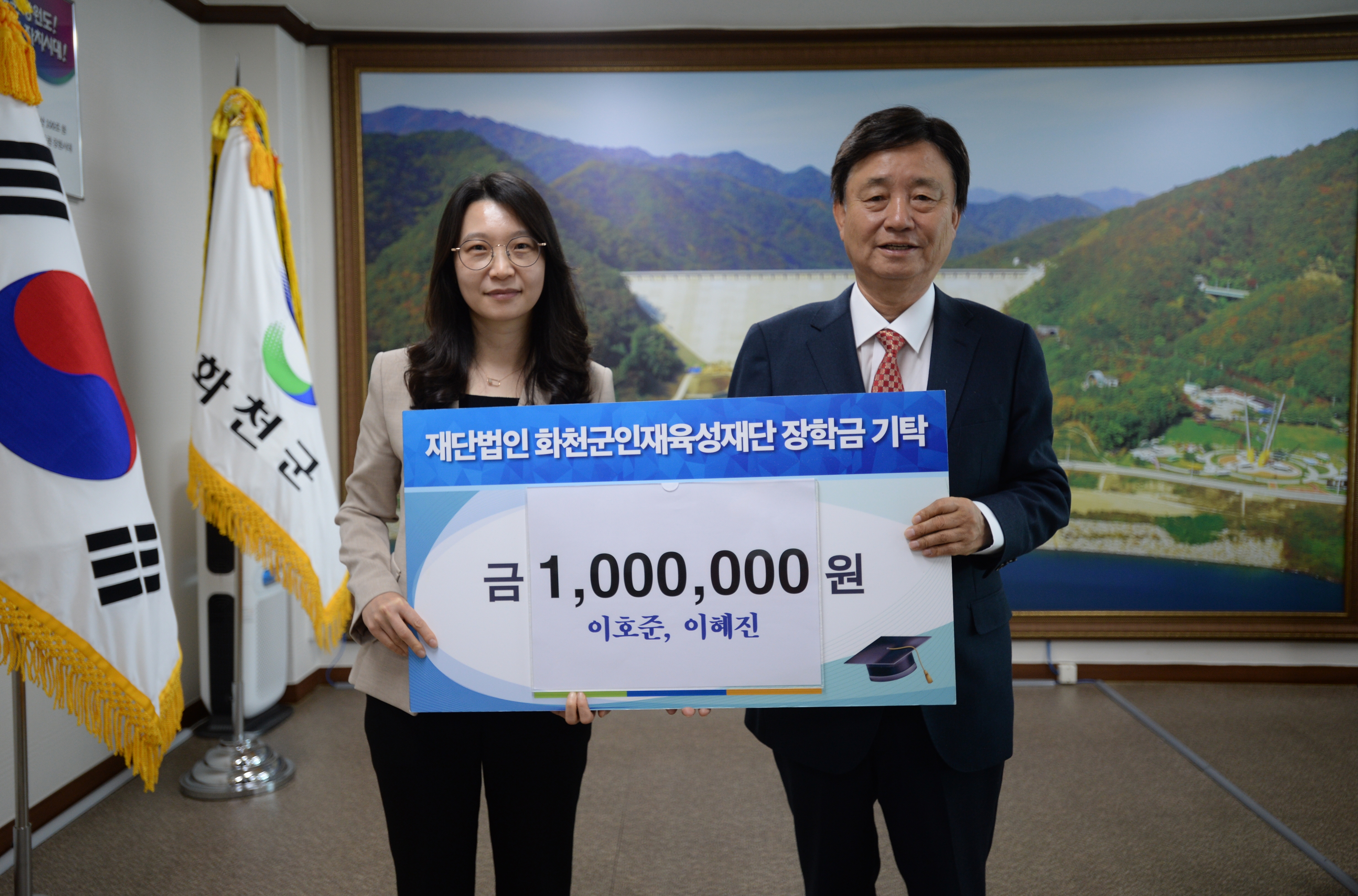 [강원사회복지신문 이정환 기자]=이호준 화천군청 관광정책과 관광기획담당과 이혜진 간동농협 과장은 지난 5월 11일 최문순 화천군 인재육성재단 이사장에게 장학금 100만원을 기탁했다.