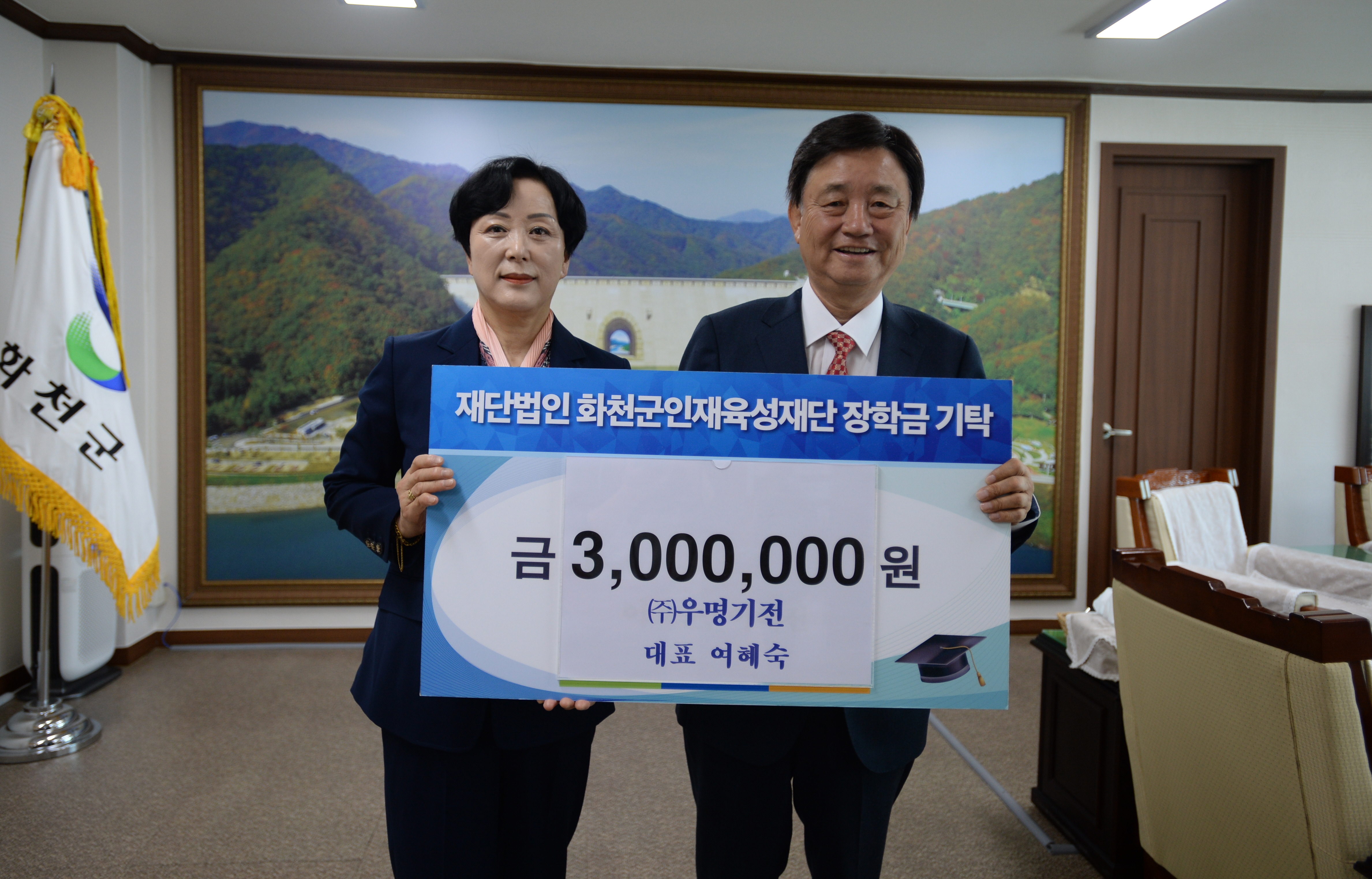 [강원사회복지신문 이정환 기자]=여혜숙 (주)우명기전 대표는 지난 5월 11일 최문순 화천군 인재육성재단 이사장에게 장학금 300만원을 기탁했다.
