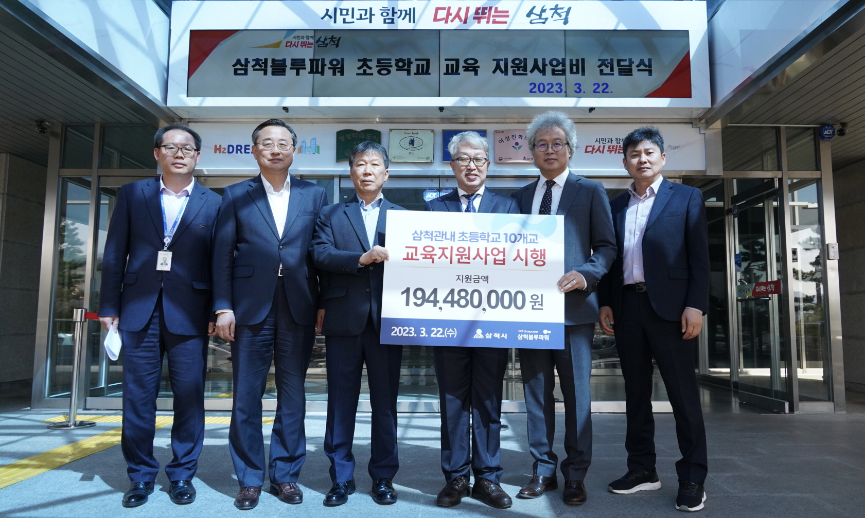 [강원사회복지신문 김종한 기자]=삼척블루파워(주)(대표이사 옥인환)와 삼척시는 지난 3월 22일(수) 삼척시청에서 미래인재 육성을 위해 삼척 관내 초등학교 10개교에 1억 9,400만 원의 교육지원금 전달식을 가졌다고 밝혔다. 이날 전달식에는 심의 지역위원회 위원장 최종훈(삼척 부시장), 근덕초등학교 김성수 교장을 비롯...