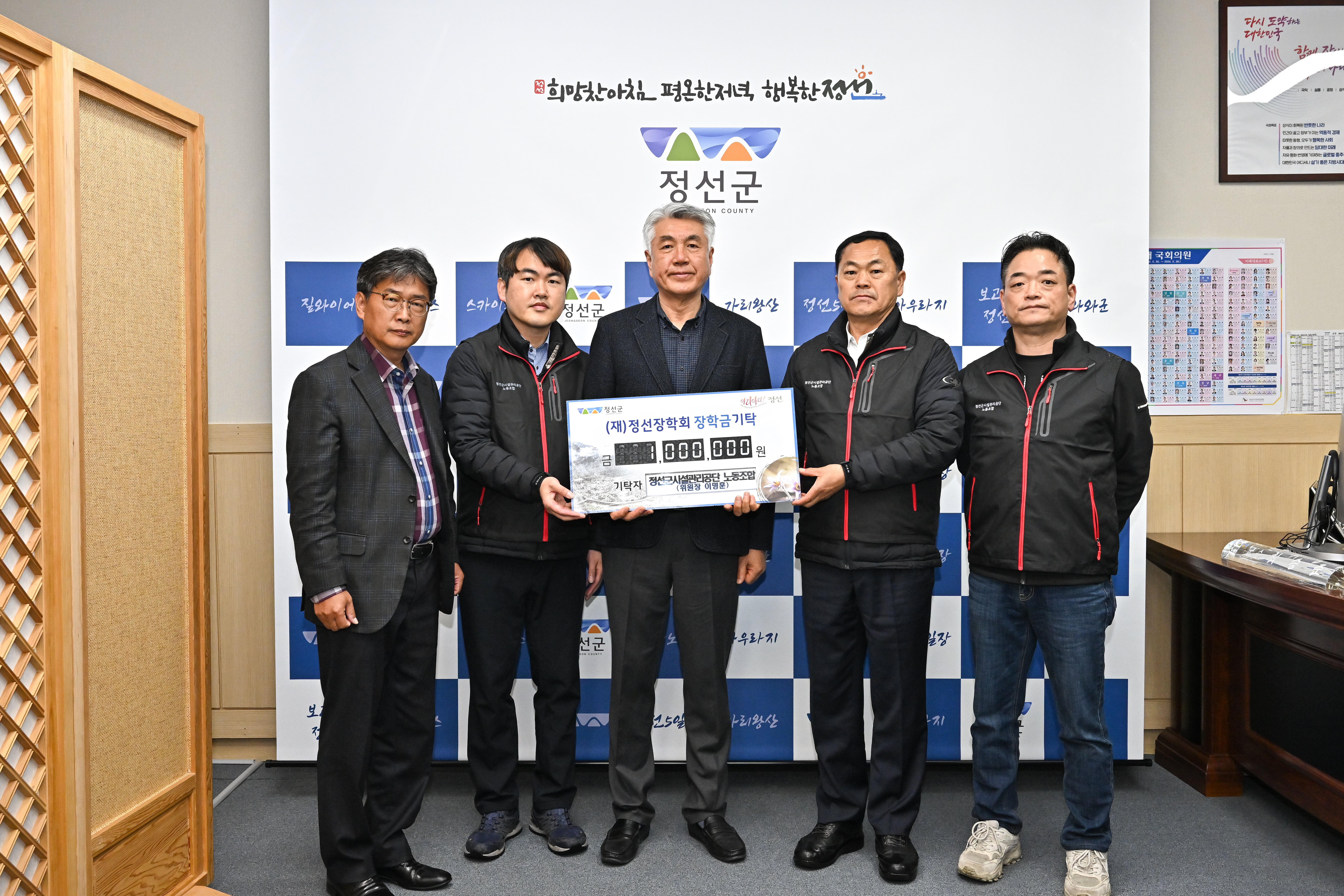 [강원사회복지신문 홍기한 기자]=정선군시설관리공단 노동조합(위원장 이명훈)은 지난 3월 23일 (재)정선장학회에 장학금 100만원을 기탁했다.