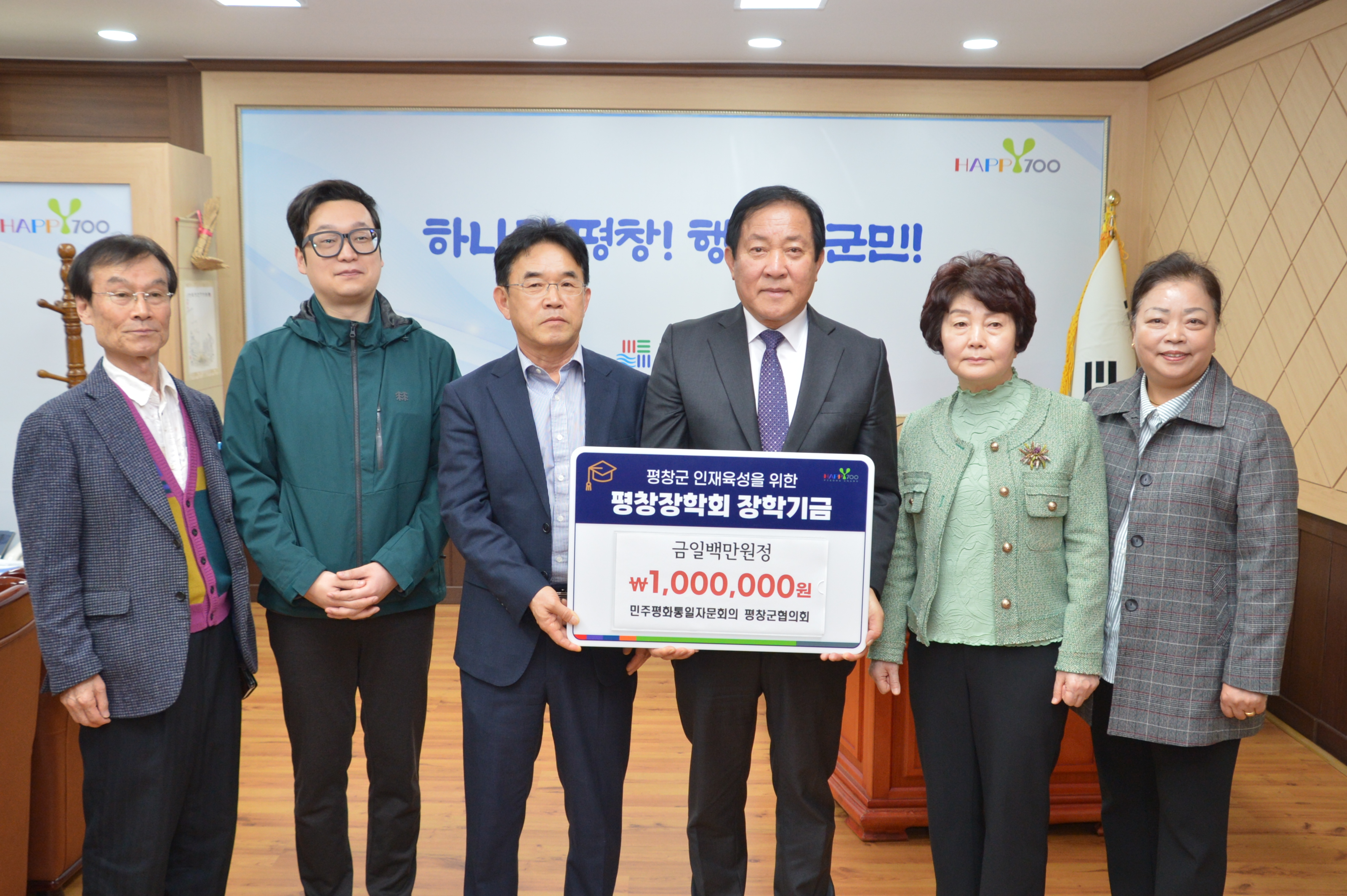 [강원사회복지신문 이정환 기자]=민주평화통일자문회의 평창군협의회(회장 최동률)는 지난 3월 23일 평창군청을 방문하여 평창장학회에 장학금 1백만 원을 기탁하였다. 최동률 회장은 "지역출신 학생들을 위한 장학사업과 지역의 교육경쟁력을 높이는 데 이바지하고자 1백만 원의 장학금을 기탁하게 됐다."라며 "꾸준한 나눔...