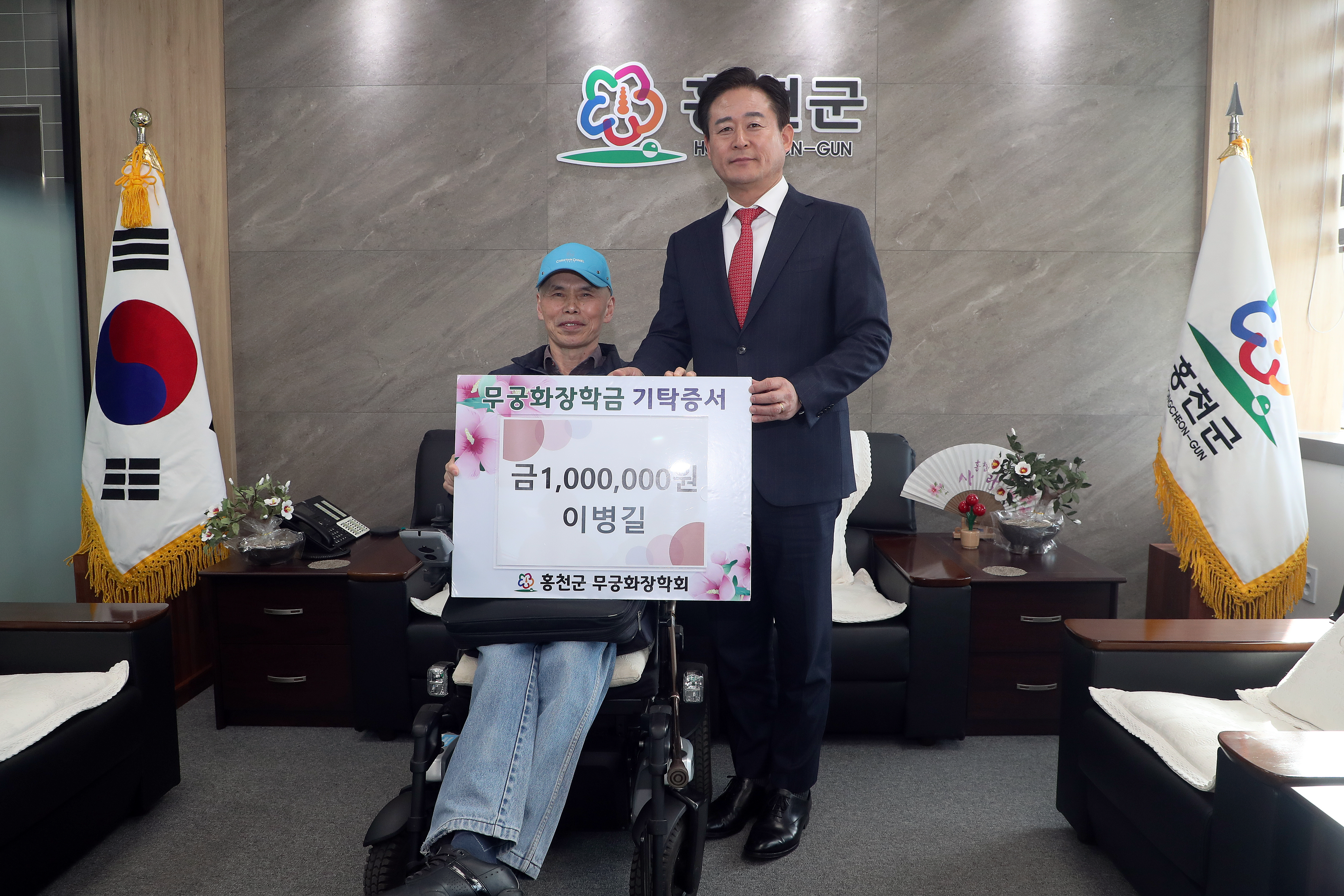 [강원사회복지신문 홍기한 기자]=홍천군 기부천사 이병길 후원자는 지난 3월 16일 홍천군청을 방문해 인재육성을 위한 무궁화장학금 100만원을 기탁했다. 이병길 후원자는 근검절약을 통해 모은 적금을 매년 3월, 지역 우수인재양성을 위해 사용해달라며 기부해오고 있다. 또한 홍천군 관내에 15년째 어려운 독거노인, 불우이...