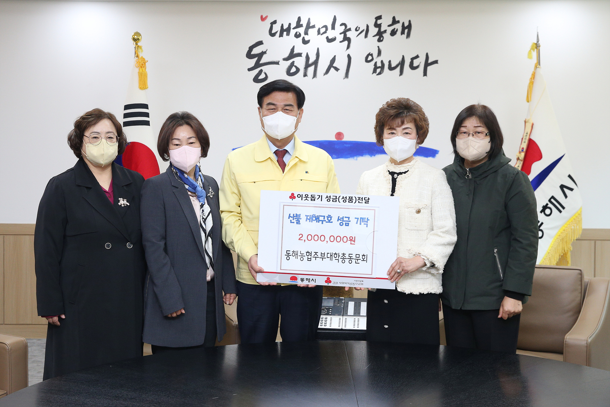 [강원사회복지신문 김종한 기자]=동해농협주부대학총동문회에서 지난 4월 5일 동해시청을 방문해 산불피해성금으로 200만원을 기탁했다.