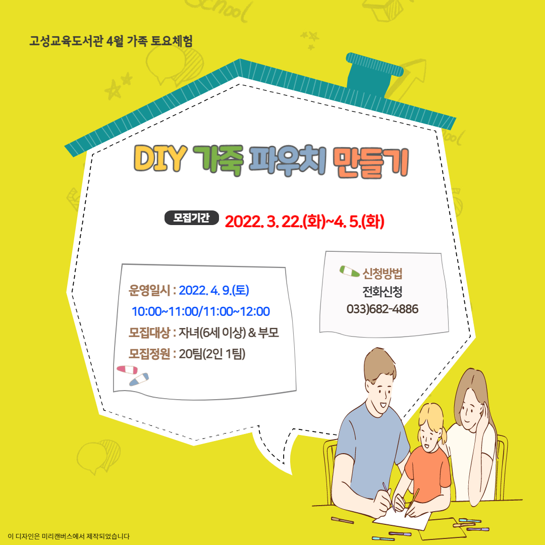 [강원사회복지신문 이정환 기자]=고성교육도서관(관장 이승봉)은 2022년 '책 놀이터, 도서관에 놀러 가자' 4월 가족 토요체험 프로그램 참가자를 지난 3월 22일부터 오는 4월 5일까지 선착순 모집한다. 4월 토요체험 프로그램은 'DIY 가죽 파우치 만들기'로 자녀(6세 이상) & 부모 20팀(40명)을 대상으로 4월 9일(토) 오...