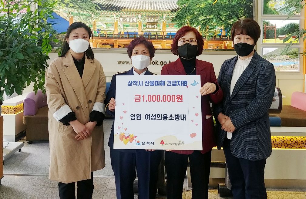 [강원사회복지신문 김종한 기자]=삼척시 임원 여성의용소방대(김경애 회장 외 2명)는 지난 3월 21일 삼척시청 본관에서 산불피해 성금으로 1백만원을 기탁했다.