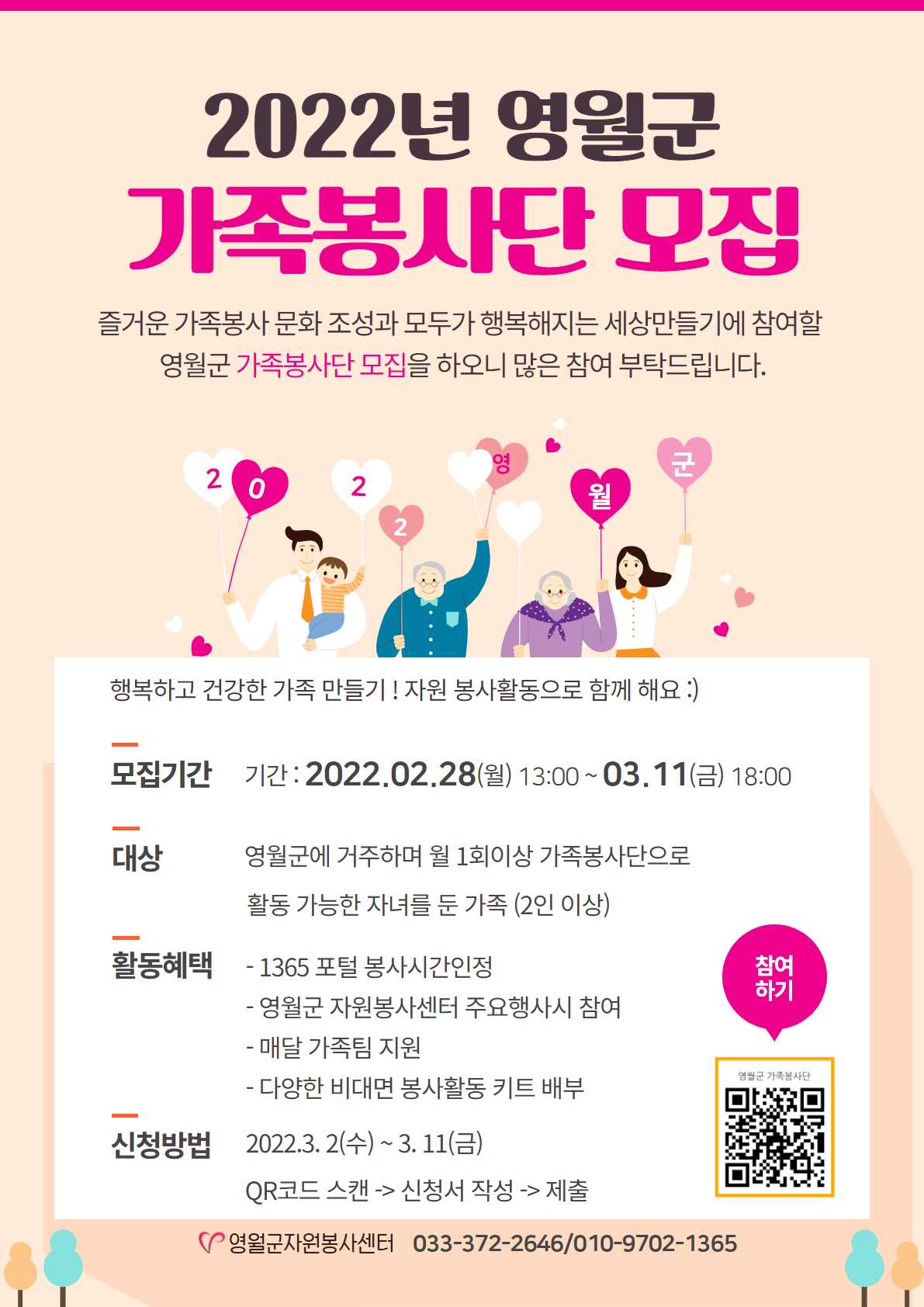 [강원사회복지신문 홍기한 기자]=영월군자원봉사센터는 '2022년도 영월군 가족봉사단'을 모집했다. 가족봉사단은 가족과 함께하는 활동을 통해 가족사랑을 확산하여 환경보호의 중요성을 알리며 모두가 행복한 세상 만들기를 실천하는 봉사단이다. 영월군에 거주하며 월1회 이상 가족봉사단으로 활동 가능한 자녀를 둔 가족이...