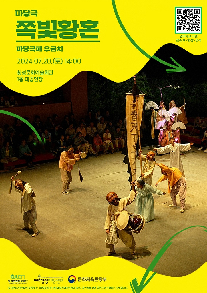 (재)횡성문화관광재단(대표이사 이재성)은 오는 7월 20일(토) 횡성문화예술회관 대공연장에서 모든 세대가 함께 즐길 수 있는 가족 마당극 <쪽빛황혼>을 선보인다. 고령화 시대에 더불어 사는 삶을 꿈꾸며 현대사회의 대안을 이야기하는 마당극 <쪽빛황혼>은 국립극장 야외놀이마당 공연 사상 최다 관객을 동원했...