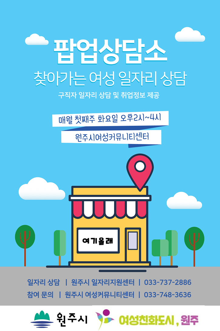7월 2일(화)부터 매월 첫째 주 화요일 오후 2시부터 4시까지 원주시여성커뮤니티센터는 구도심 지역 취업 취약계층 구직과 여성 일자리 상담을 위한 ‘POP UP 상담소’를 운영한다. 7월 2일(화)부터 매월 첫째 주 화요일 오후 2시부터 4시까지 진행하며, ▲기업지원일자리과 전문상담사 연계 ▲구도심 지역 경력단절 여성 취...