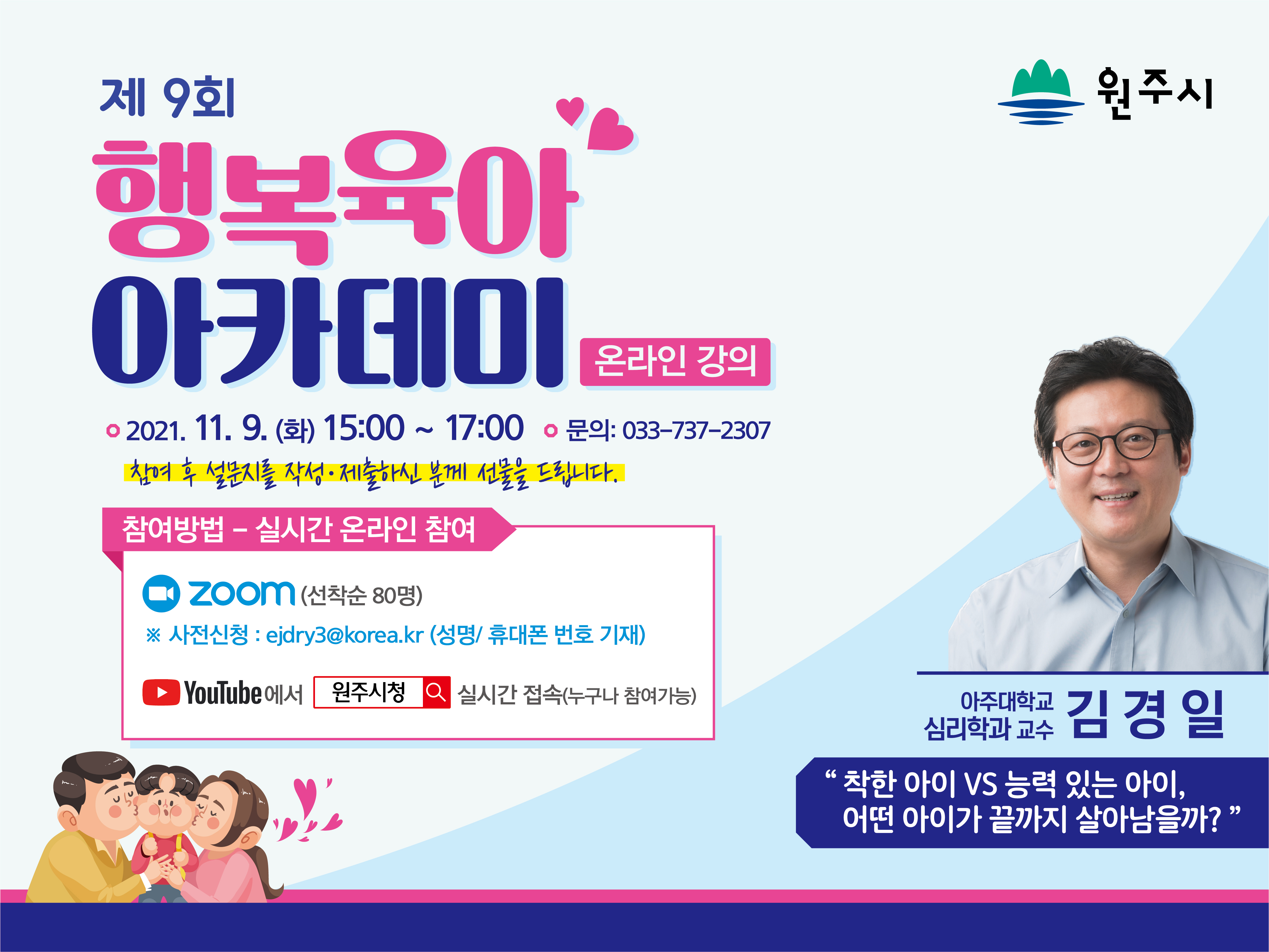 [강원사회복지신문 서은진 기자]=착한 아이 vs 능력 있는 아이, 어떤 아이가 끝까지 살아남을까? 11월 9일 오후 3시, 김경일 교수 초청 강연 줌(ZOOM)·유튜브로 만나요! 원주시는 '제9회 행복육아 아카데미'를 오는 11월 9일 오후 3시 줌(ZOOM)과 원주시청 유튜브 채널을 통해 온라인 스트리밍으로 진행한다. '행복육아 아카...
