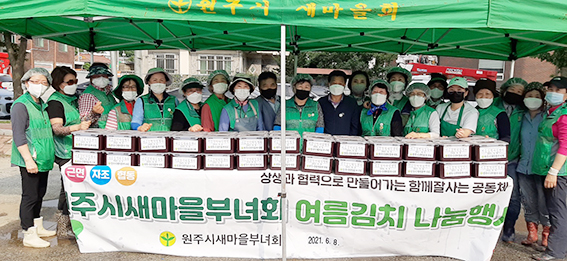 회원 50여 명 참여, 배추 300포기 분량 김치 취약계층 125세대 전달 [강원사회복지신문 서은진 기자]='2021 원주시 새마을부녀회 여름김치 나눔' 행사가 지난 6월 8일 회원 등 50여 명이 참석한 가운데 원주시 새마을회관에서 열렸다. 이날 담근 배추 300포기 분량의 김치는 읍면동별로 취약계층 5세대씩을 선정해 총 125세대...