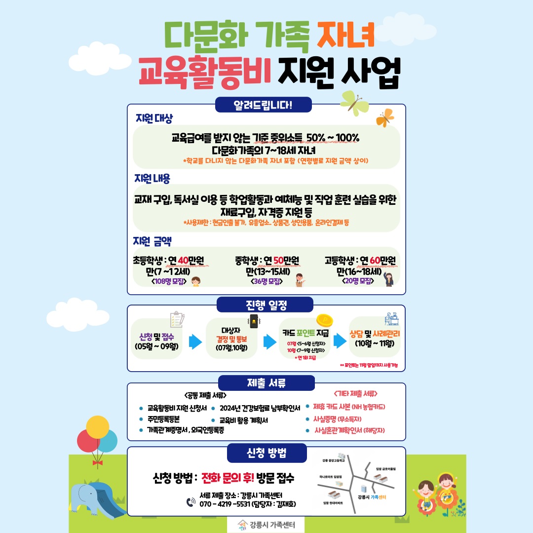 강릉시 가족센터 (센터장 최은해)는 다문화 가족 자녀의 학교생활 적응을 지원하기 위해 2024년 시범사업으로 ‘다문화 가족 자녀 교육활동비 지원사업’을 추진한다. 대한민국은 저출산으로 전체 학생 수가 감소하는 상황에서도 다문화 학생 수는 지속적으로 증가하고 있으며 다문화 가족 자녀는 학업 적응, 진로 설계에 어...
