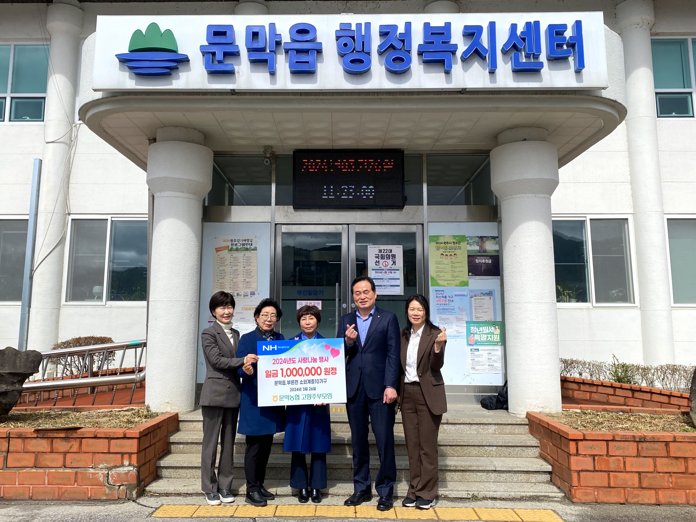 원주시 문막농협 고향주부모임(회장 한혜영)에서는 지난 3월 26일 문막읍행정복지센터를 방문하여 문막·부론의 어려운 이웃 10가구 지원을 위한 후원금 100만원을 전달하였다.
