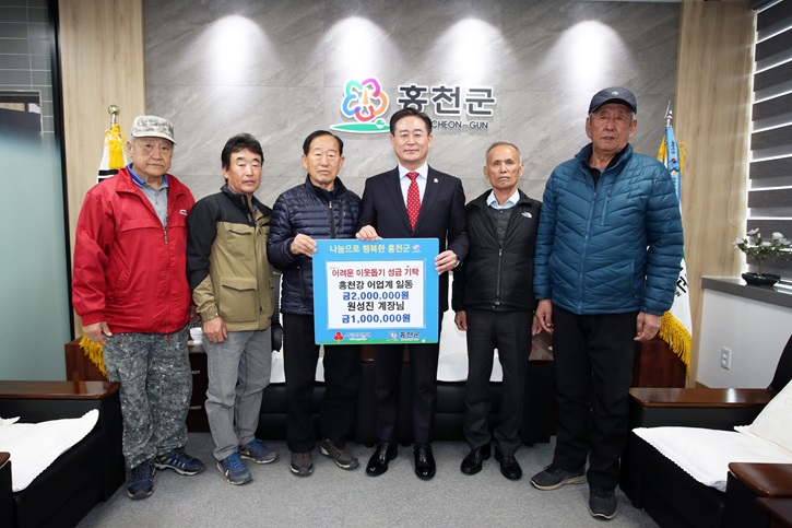 홍천강 어업계(계장 원성진)는 지난 3월 19일 홍천군청을 방문, 어려운 이웃돕기 성금 300만원을 기탁했다. 기탁한 성금 중 200만원은 홍천강 어업계 회원들이 십시일반 모아 기탁하였고, 100만원은 원성진 계장이 단독으로 기부했다.