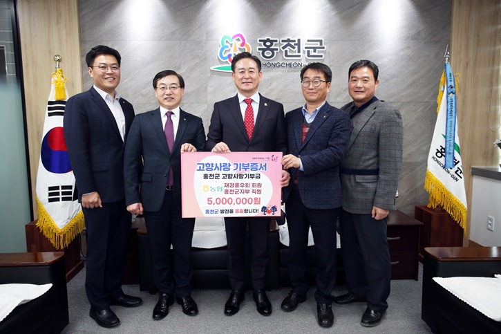 NH농협 재경홍우회 회원 및 홍천군지부 직원은 지난 3월 19일 홍천군청을 방문하여, 홍천군 발전을 위해 마음을 모아 고향사랑기부금 500만원을 전달했다. 전달된 기부금은 박정균(농협중앙회 상호금융자산운용본부장)과 박광원(농협은행 기업디지털플랫폼부 부장), 전성열(농협중앙회 홍천군지부장)이 각 100만원씩 고액을 ...