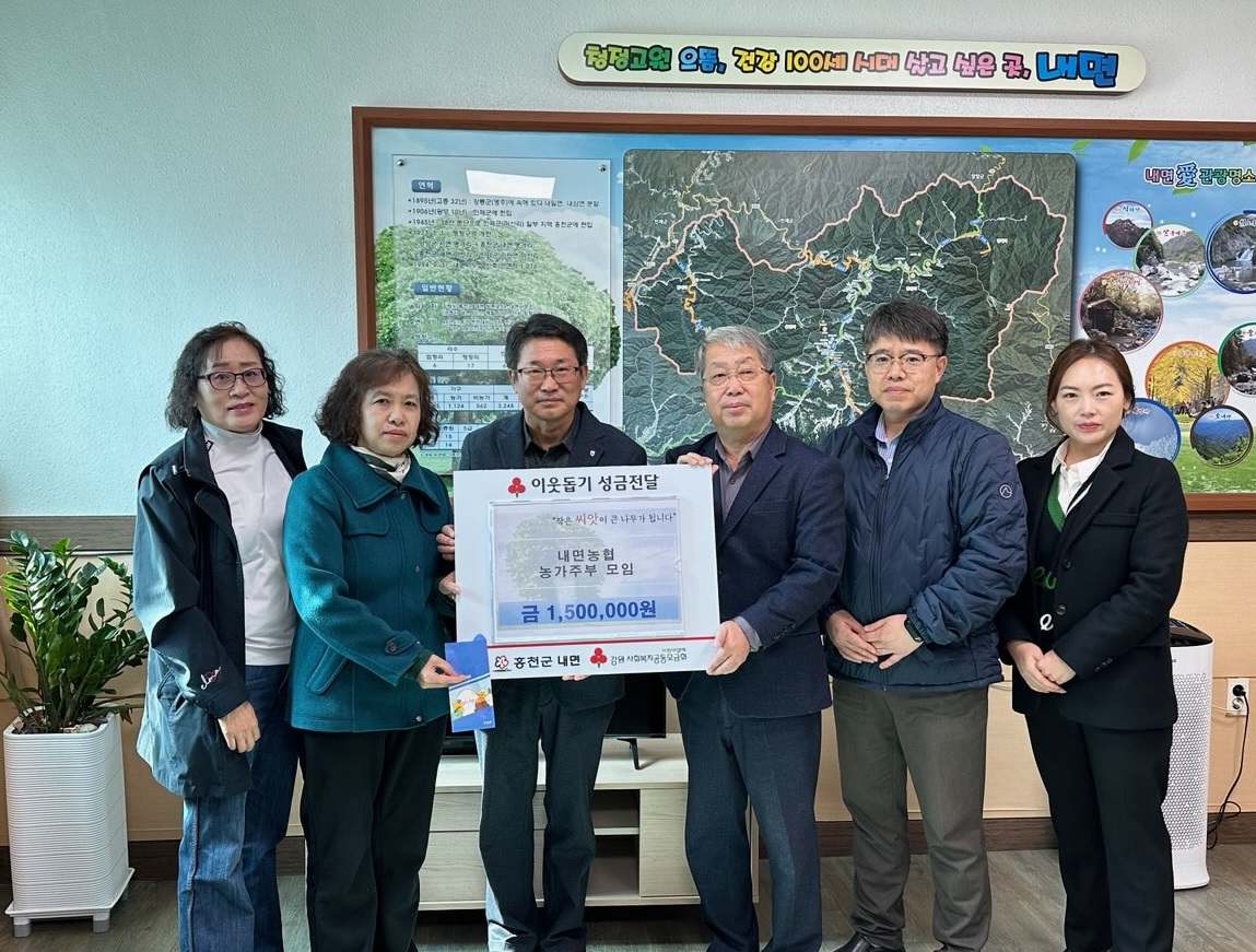 내면농협 농가주부모임(회장 박미자)은 지난 3월 18일 홍천군 내면 행정복지센터를 방문하여 내면 복지발전을 위해 이웃돕기 성금 150만원을 기탁하였다. 기탁한 성금은 강원도사회복지공동모금회를 통하여 어려운 이웃돕기 및 지역사회보장협의체 ‘씨앗’에 적립 후 특화사업 등 적재적소에 사용할 예정이다.