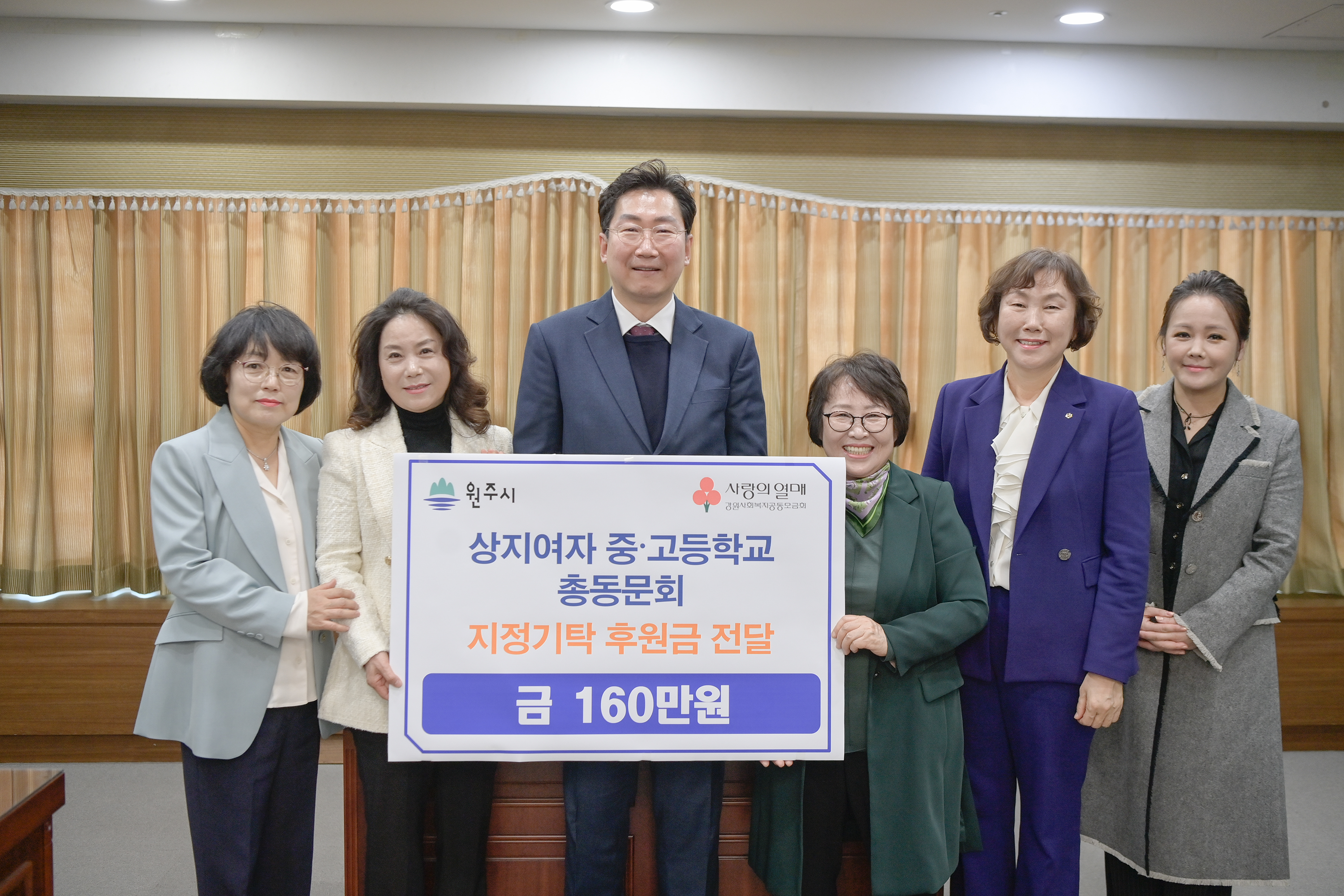 상지여자중·고등학교 총동문회(회장 김명호)는 지난 3월 14일 원주시청을 방문하여 지정기탁 후원금 160만 원을 기부했다. 후원금은 사회복지공동모금회를 통해 원주시 저소득 가정에 전달될 예정이다. 김명호 회장은 “어려움에 처한 이웃을 외면하지 않고 함께 살아가는 아름다운 사회가 되길 바란다.”며, “지역 내 취약...