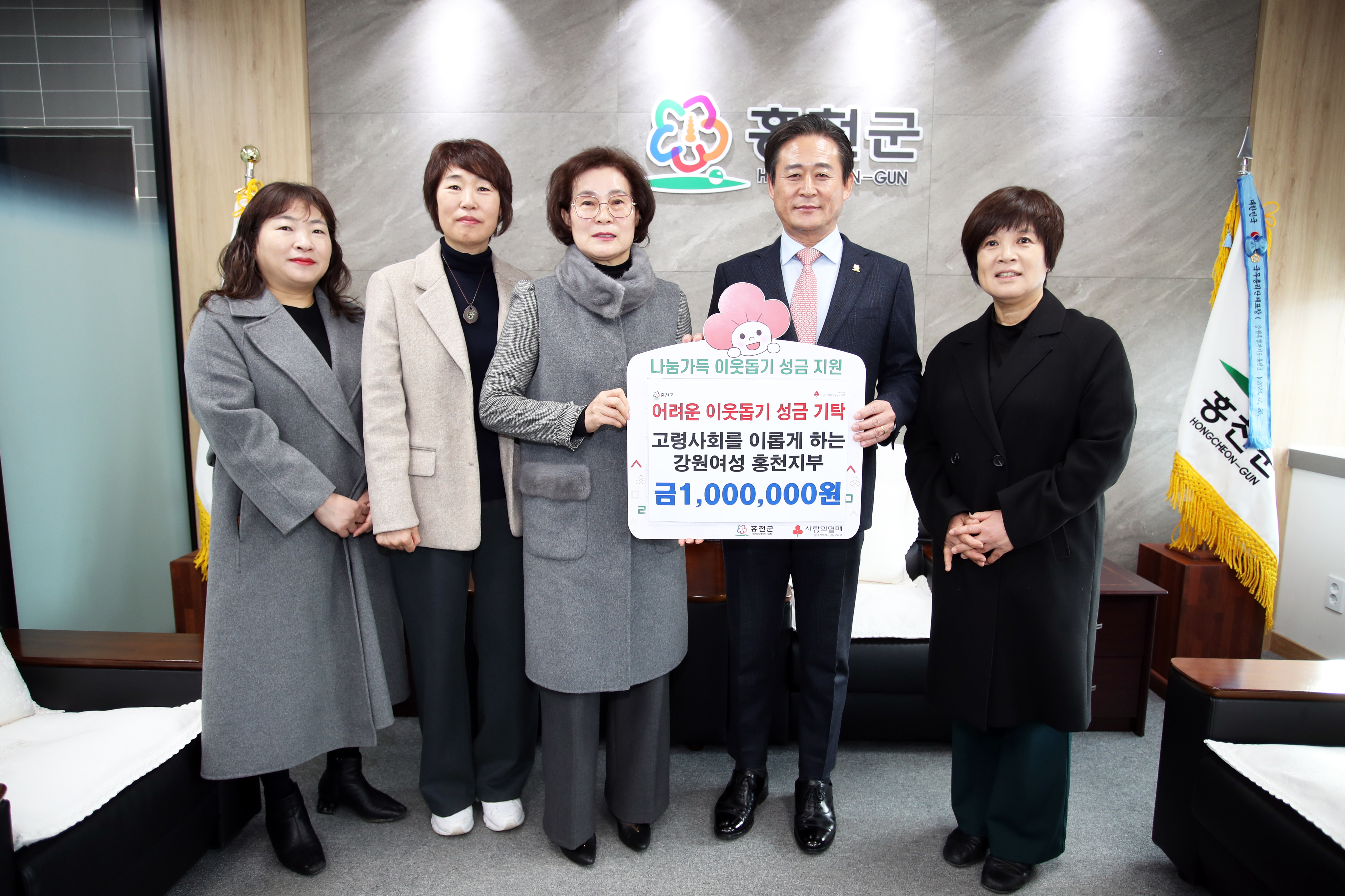 고령사회를 이롭게 하는 강원여성 홍천지부(지부장 김옥순)는 지난 2월 27일 홍천군청을 방문, 어려운 이웃돕기에 성금 100만원을 기탁했다. 김옥순 지부장은 “지역사회에 조금이나마 도움이 되었으면 하는 마음에서 회원들이 십시일반 모은 회비로 후원하게 되었다.”라고 말했다. 한편 전달된 성금은 강원 사회복지공동모...