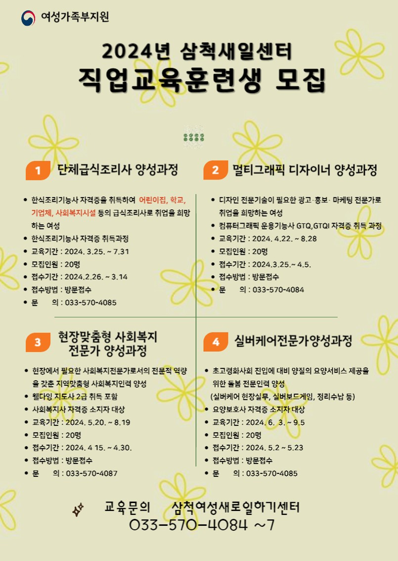 삼척여성새로일하기센터는 경력단절 여성 등의 취업역량을 강화하고 여성 전문인력 양성을 위해 3월부터 9월까지 2024년도 직업교육훈련 프로그램을 운영할 계획이다. 올해는 단체급식조리사, 멀티그래픽디자이너, 현장 맞춤형 사회복지전문가, 실버케어전문가 총 4개 과정으로, 각 과정별 20명을 모집하며 수강료는 전액 국...