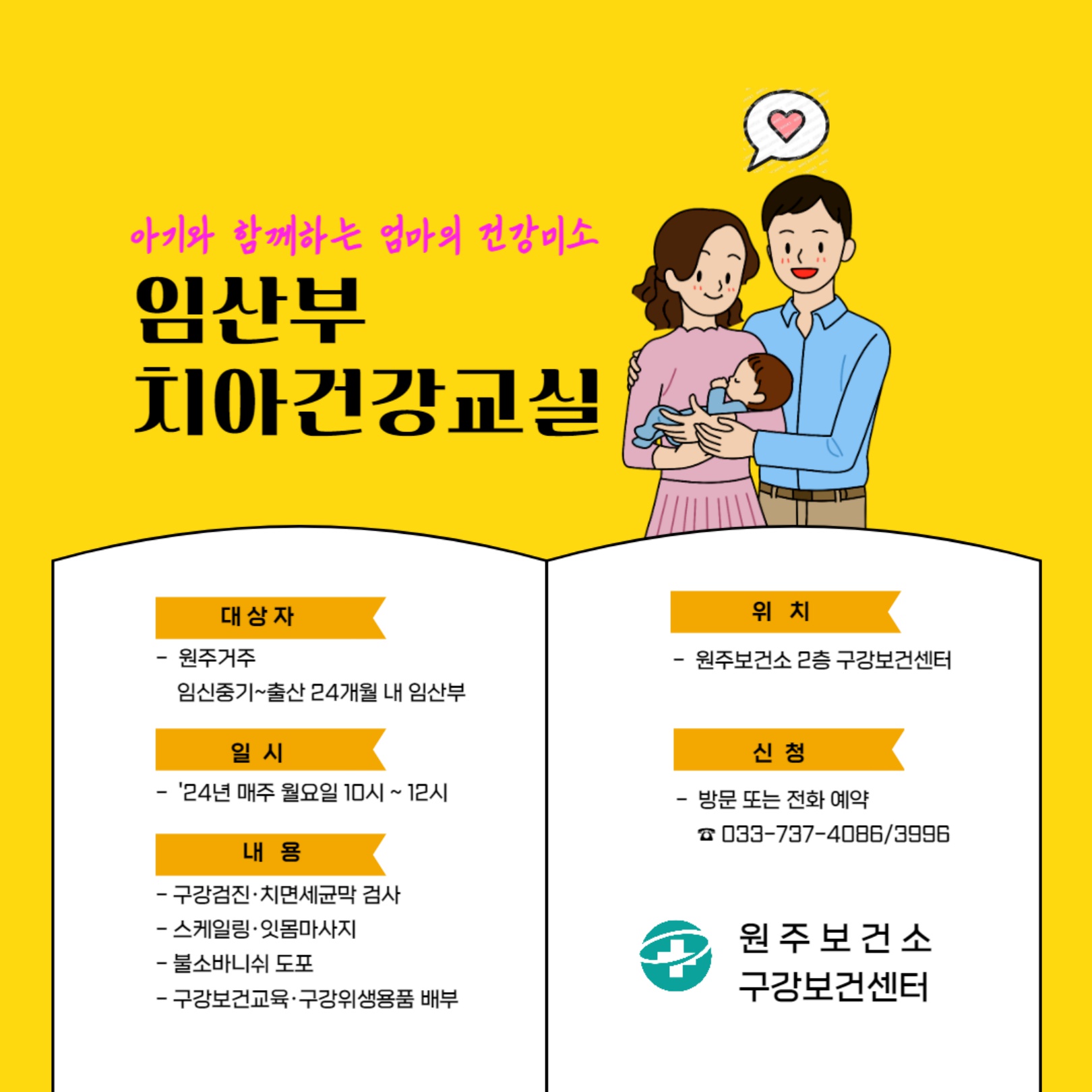 원주시보건소 구강보건센터는 임산부와 영유아 구강건강관리를 통해 올바른 구강건강 습관 형성과 엄마와 아기의 구강건강증진을 도모하고자 ‘임산부 치아건강교실’을 운영한다. 원주시에 거주하는 임신 중기 또는 출산 2년 이내 임산부 100명을 모집하며, 원주보건소 구강보건센터에 전화(033-737-4086/3996) 또는 방문 신...