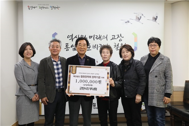 철원군 갈말읍 군탄1리 부녀회(회장 이옥례)는 지난 11월 7일 철원군청을 찾아 지역 인재육성을 위해 사용해달라며 장학금 100만원을 기부했다. 또한 지난 11월 6일에는 인재육성과는 2022년 성과관리 및 자체평가 우수포상금 100만원을 장학금으로 기탁했으며, 주식회사 진우산업(이옥영) 도 장학금 300만원을 철원군장학회...